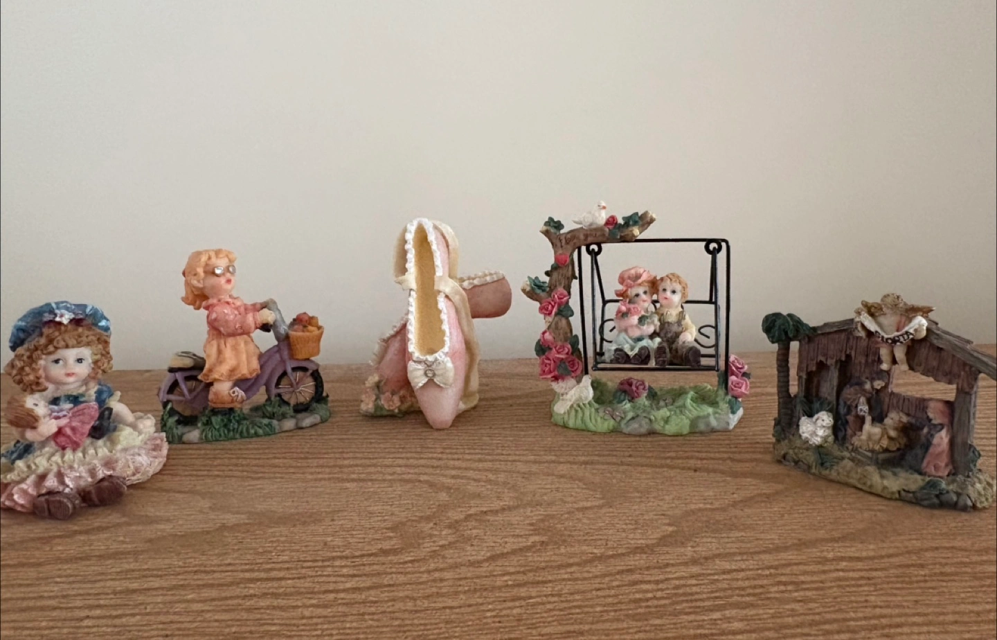 This is a set of 5 charming figurines that would make a delightful addition to any collection or a decorative touch to your home. These pieces have been lovingly cared for and are in good condition.