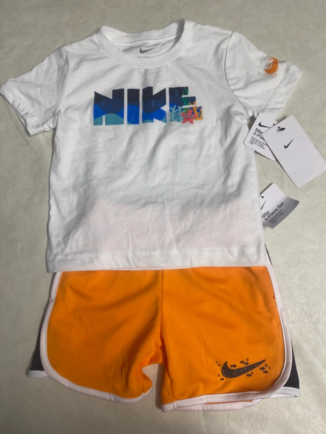 This adorable Nike 2-piece set is brand new with tags! The set includes a white t-shirt with a colourful Nike logo and orange shorts with a Nike swoosh design. Perfect for your little one!