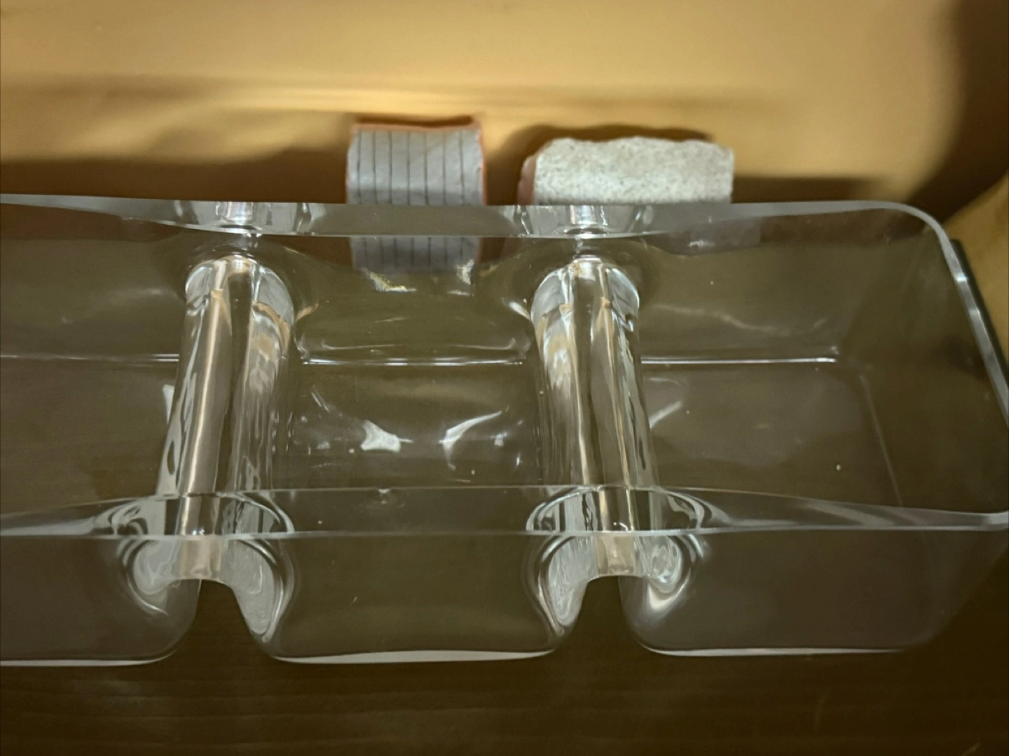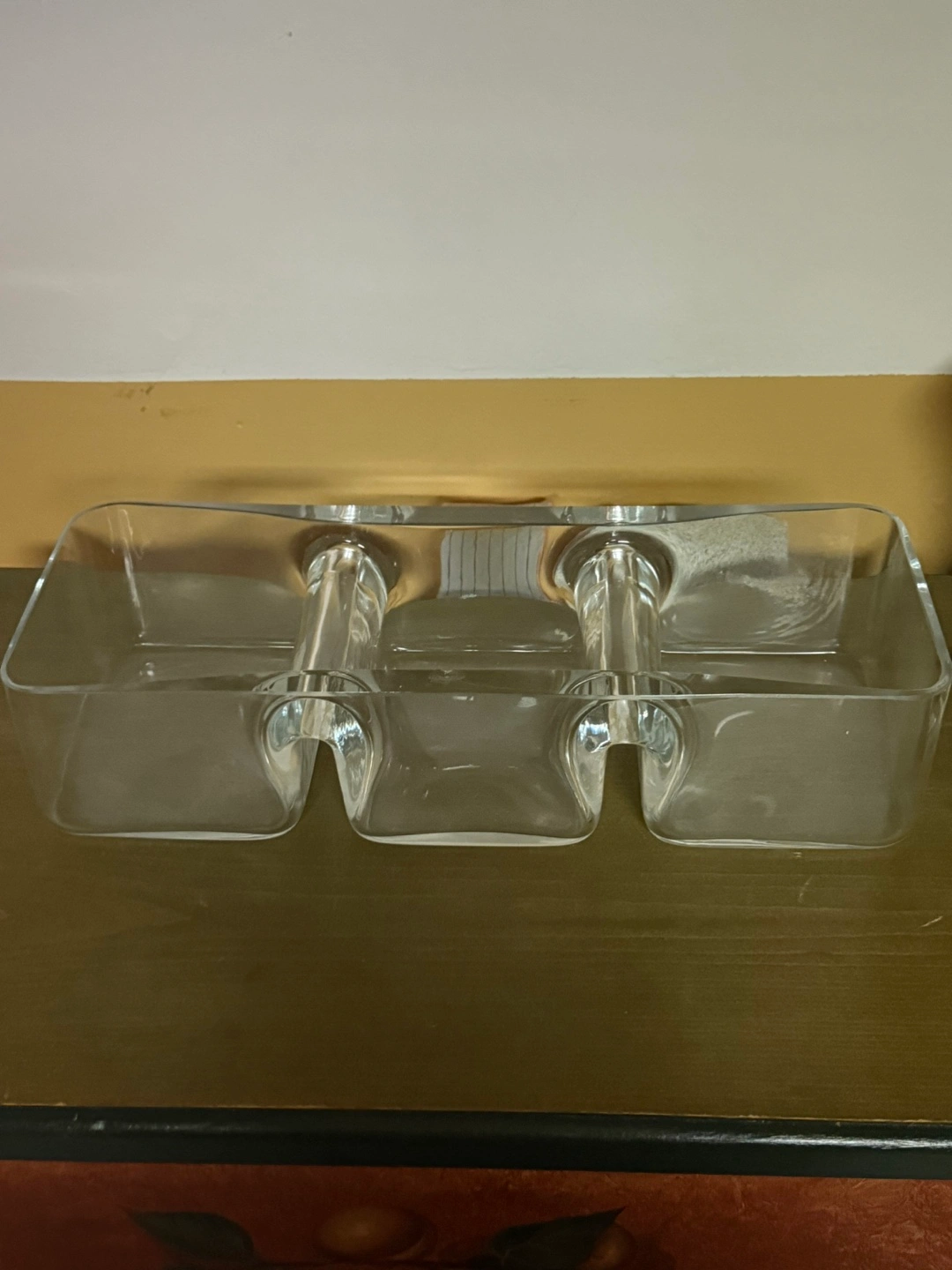 Here's a clear acrylic condiment server, perfect for organizing your sauces and toppings! It features three compartments to keep everything tidy and accessible. It's in great condition and ready to add a touch of organization to your kitchen or dining area