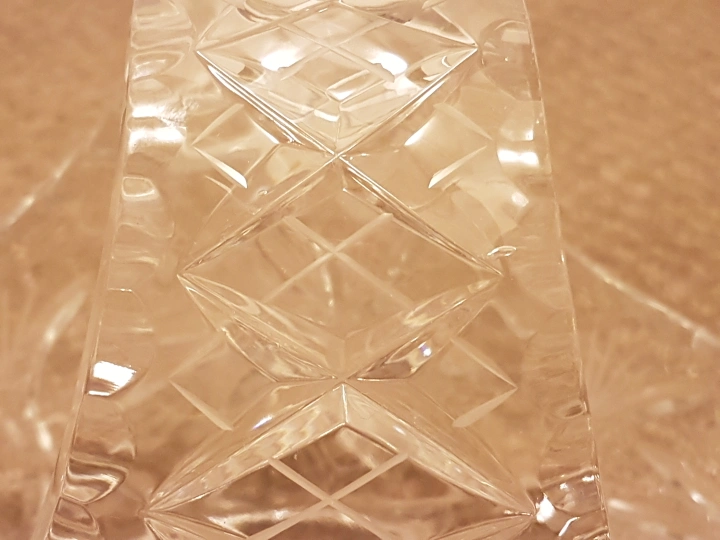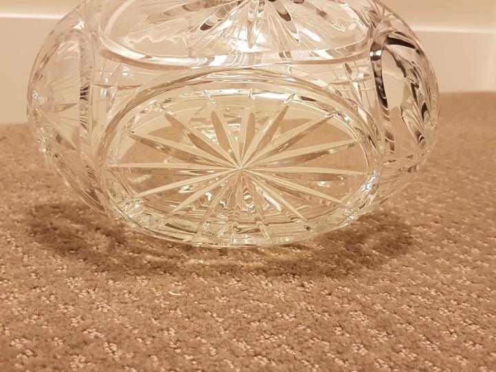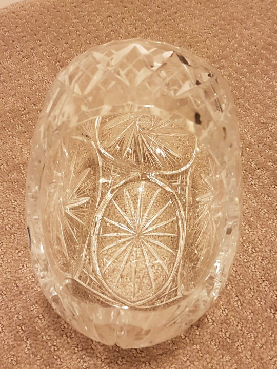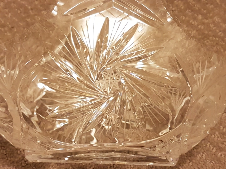 I am selling an Exquisite Hand-Cut 24% Lead Crystal Basket with Handle - Pinwheel & Diamond Design in excellent condition. This stunning and substantial hand-cut crystal basket is a true piece of art, perfect for adding a touch of classic elegance to any home. The basket features a beautiful and intricate design, including a striking starburst or "pinwheel" pattern on the base and surrounding sides, which catches and reflects light in a dazzling display. The solid handle is adorned with a detailed diamond and crisscross pattern, adding to its sophisticated appeal.