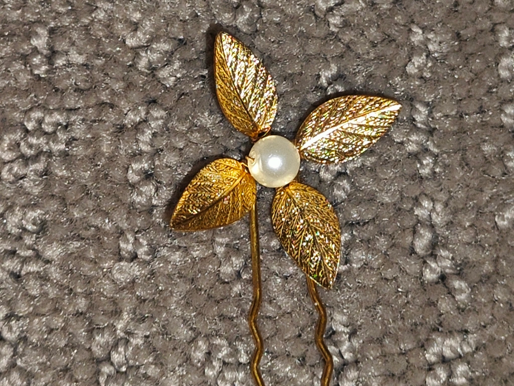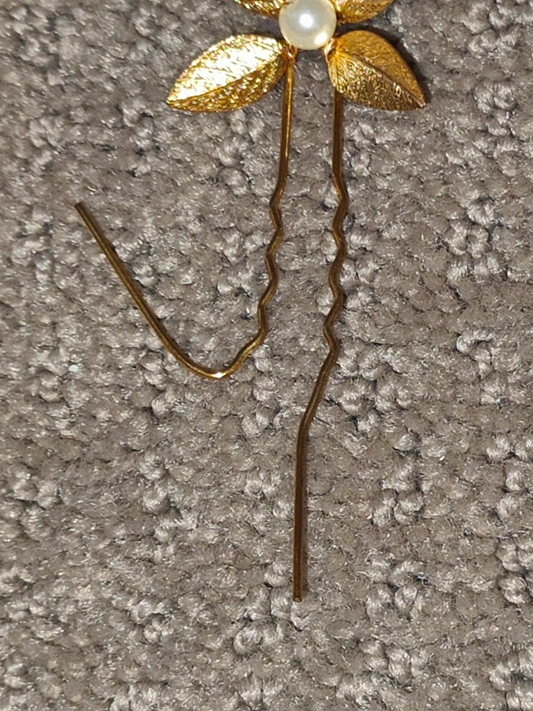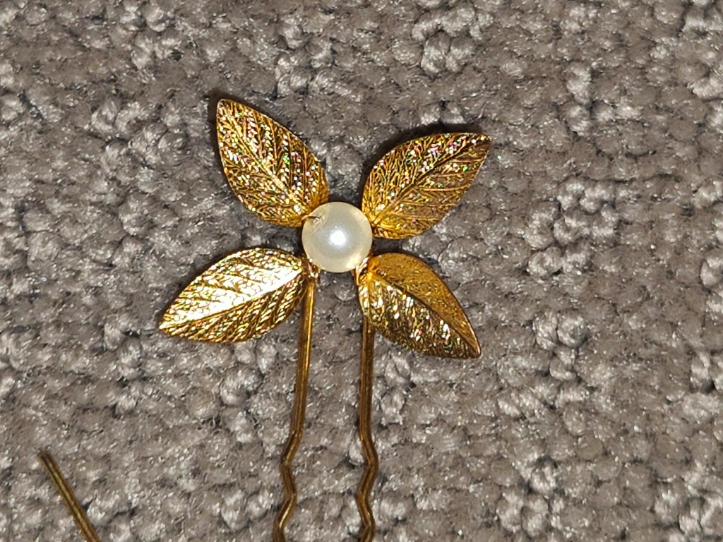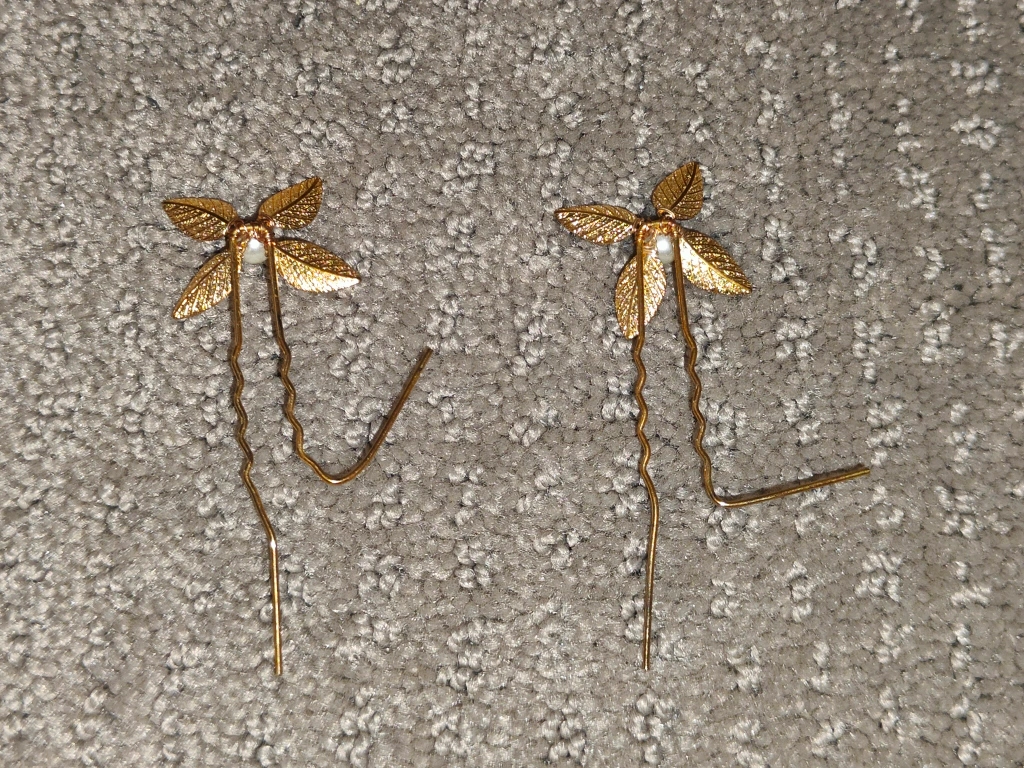 I am selling a Matching Pair of Bride Flower Hair Pins / Wedding Gold Leaf Hair Accessories Headpiece in used, excellent condition. These were handmade and purchased. Elevate your bridal look with this stunning leaf-shaped hair pin, in gold with four gold leaves and a pearl-like center. Its shimmer adds elegance to any hairstyle. Versatile for updos, half-up styles, or as a standalone piece.