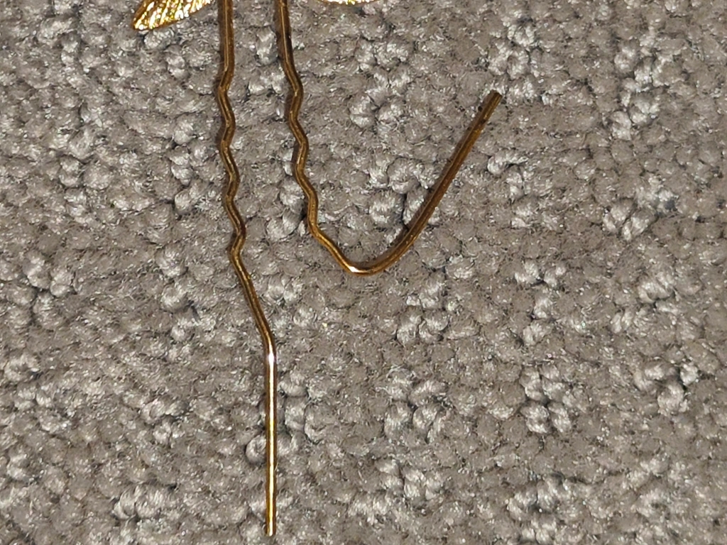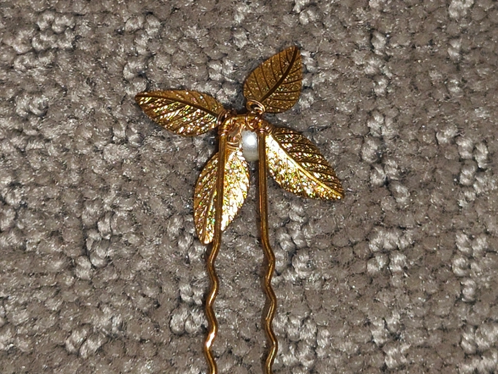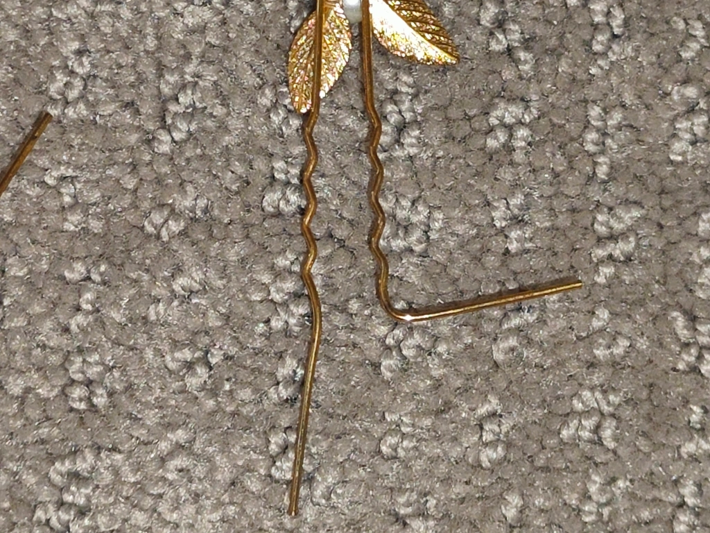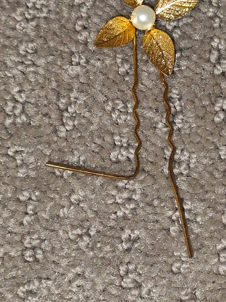 I am selling a Matching Pair of Bride Flower Hair Pins / Wedding Gold Leaf Hair Accessories Headpiece in used, excellent condition. These were handmade and purchased. Elevate your bridal look with this stunning leaf-shaped hair pin, in gold with four gold leaves and a pearl-like center. Its shimmer adds elegance to any hairstyle. Versatile for updos, half-up styles, or as a standalone piece.