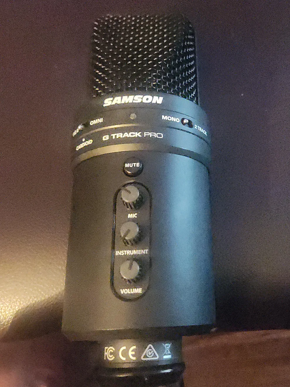 Selling a Samson G Track Pro microphone! It's in great condition and ready to use. Features include Omni, Cardioid, and Mono modes, as well as mute, mic, instrument, and volume controls