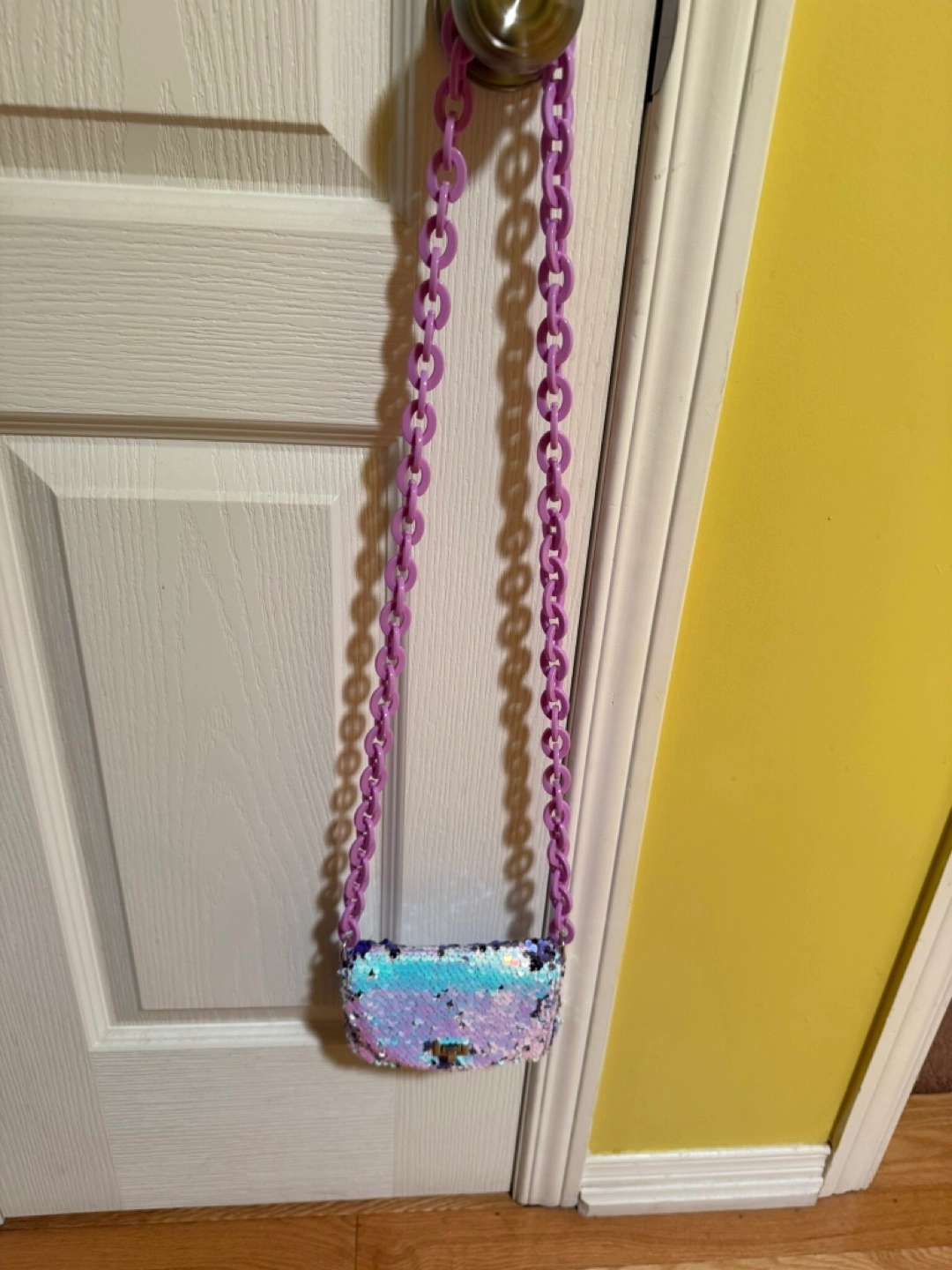 194Super cute sequin purse with a pastel colour scheme and a lilac chain strap! Perfect for a little one to carry their treasures around in