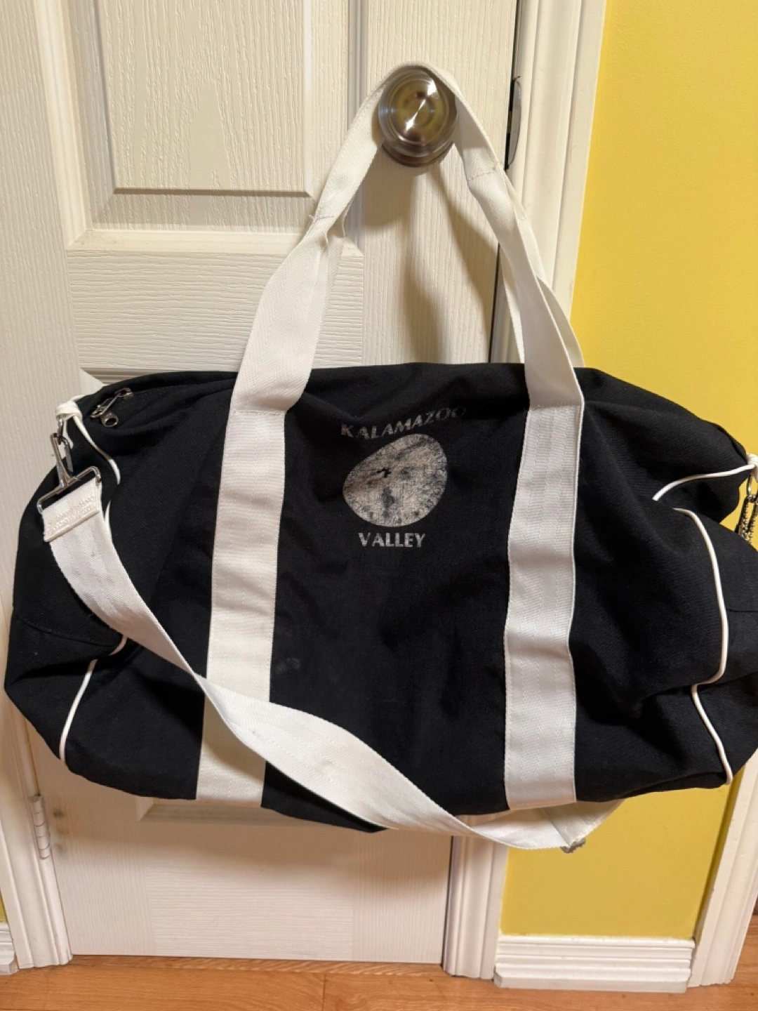 194Here's a great Eastpak duffle bag featuring the Kalamazoo Valley logo! It's black with white straps, perfect for the gym or a weekend getaway