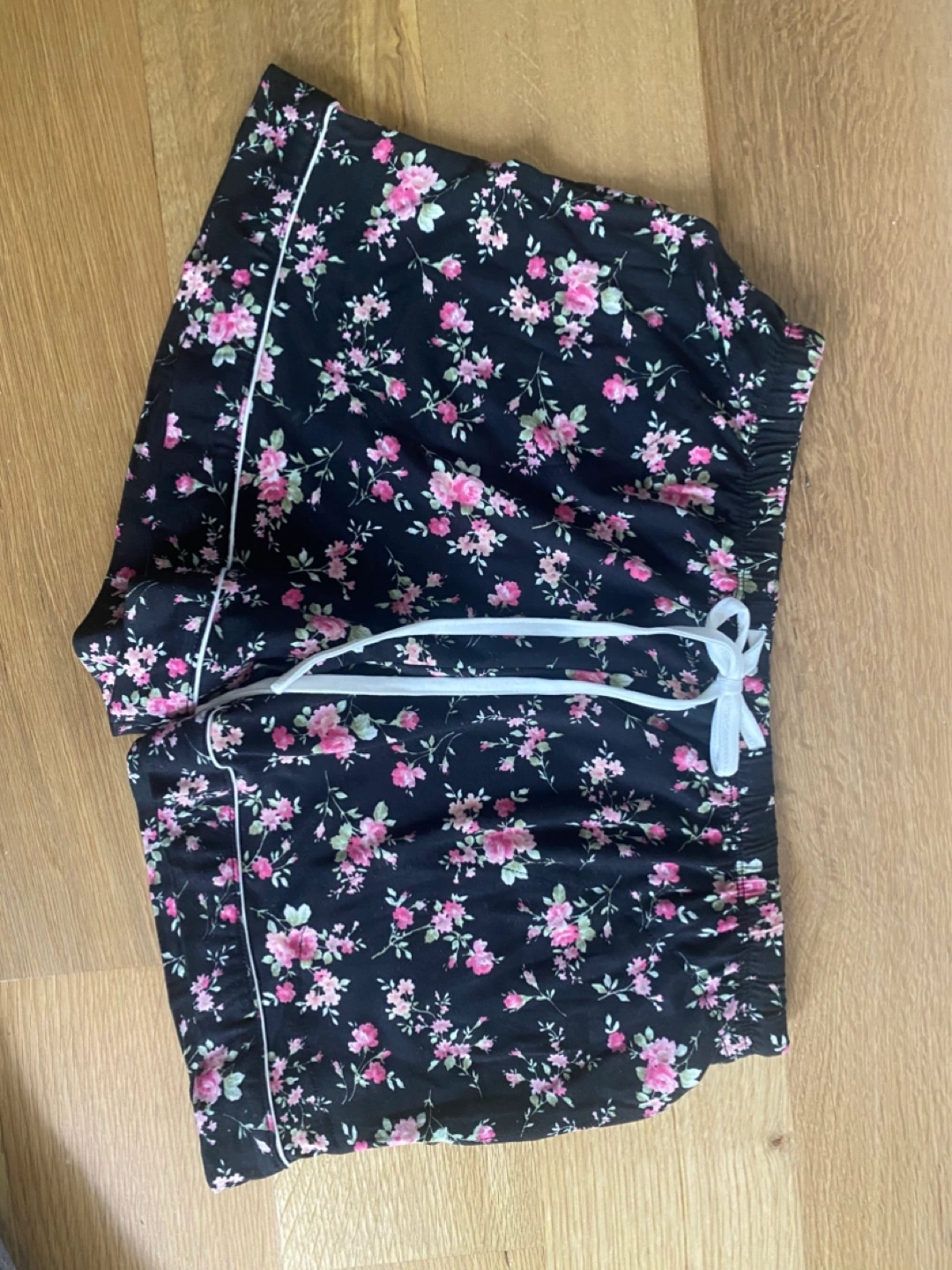 Selling a cute Flora by Flora Nikrooz pajama set! It features a black background with a pink floral pattern and white piping. The set includes a button-down top and shorts. Size is small.