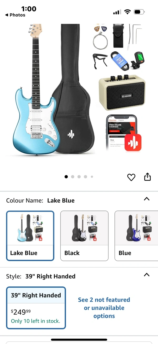 Looking to start playing the electric guitar? This Donner beginner kit is perfect! It's a 39-inch right-handed guitar in a beautiful Lake Blue colour. This all-in-one kit includes everything you need to get started, including a portable mini amp, headphones, a guitar bag, and more! Originally bought for $249.99.