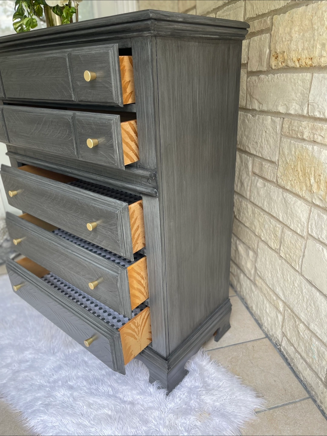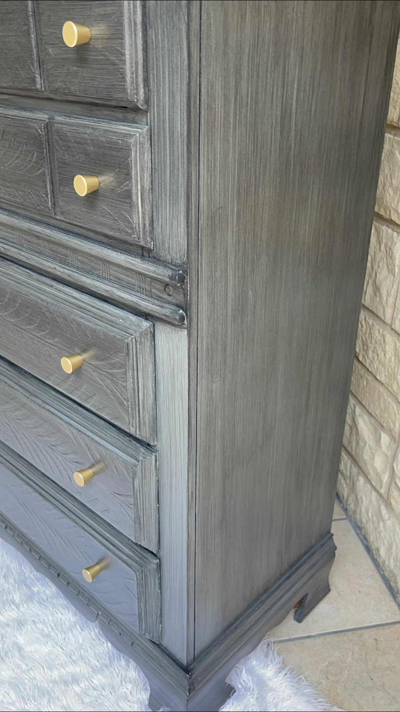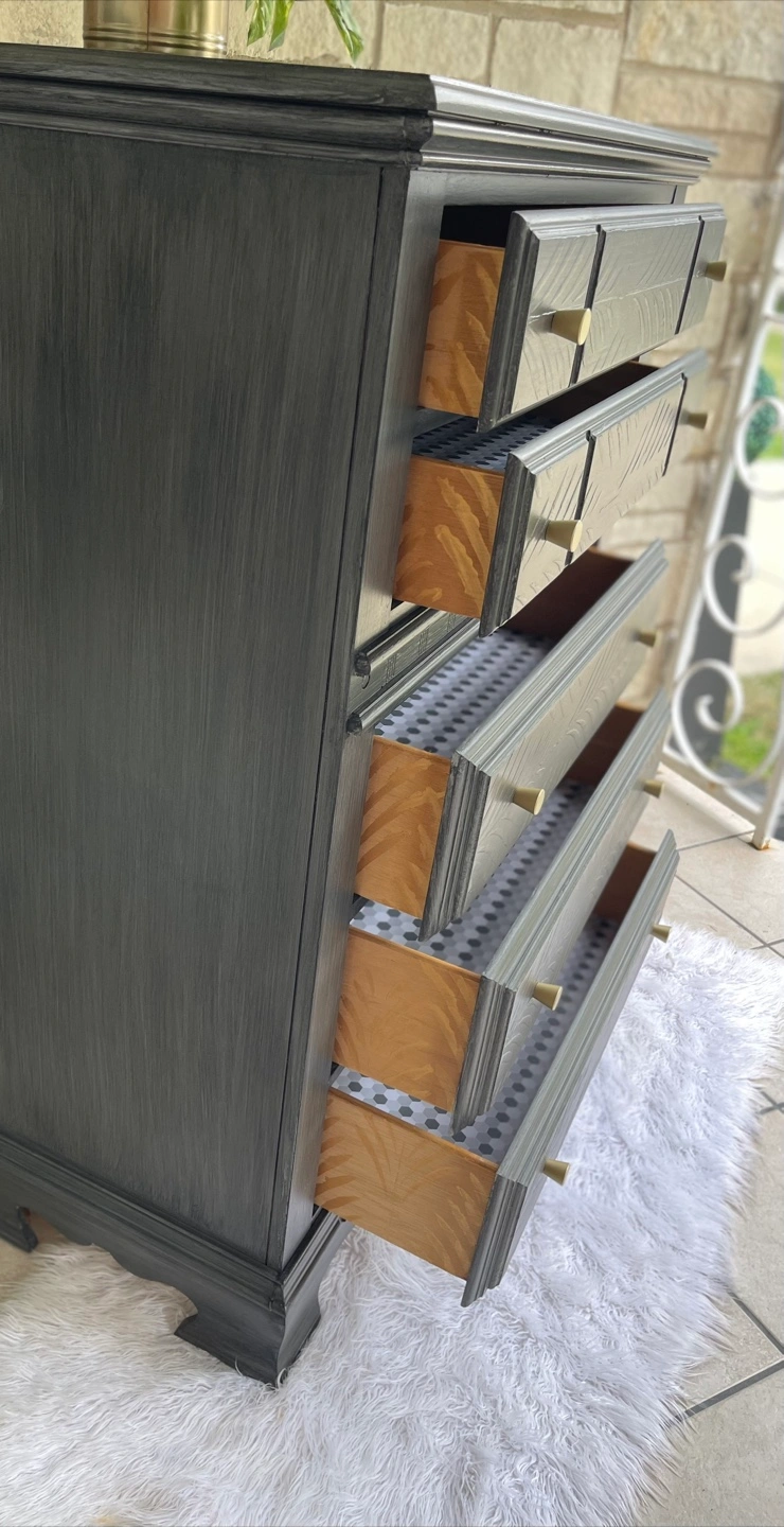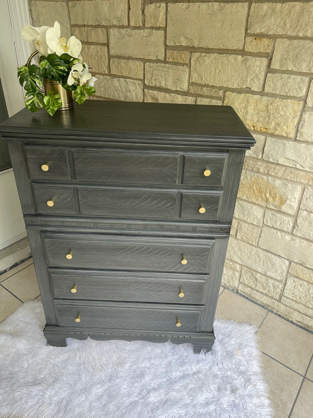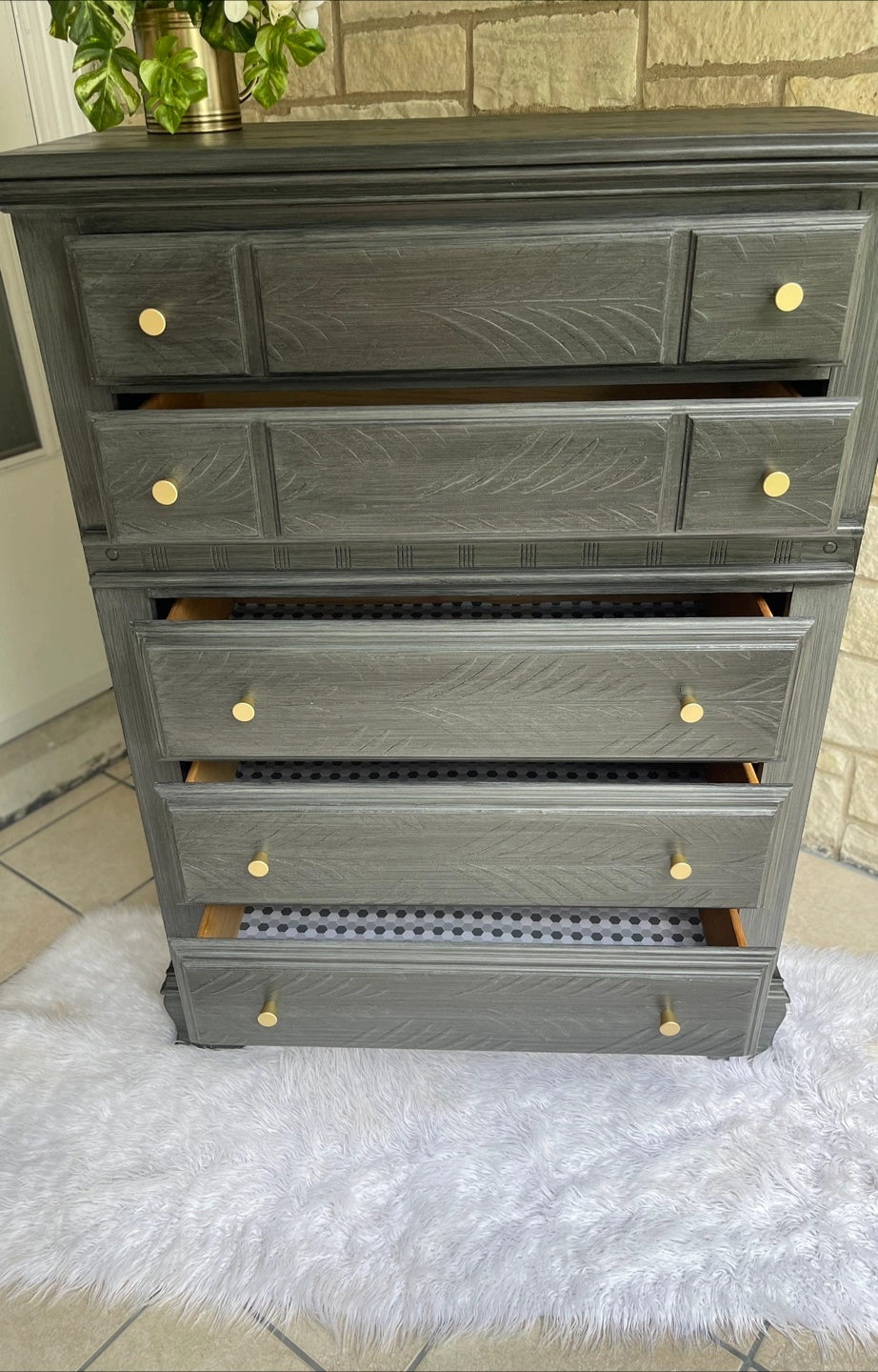 Beautiful 5 drawers dresser redone in modern gray brushed finish. Very versatile piece.