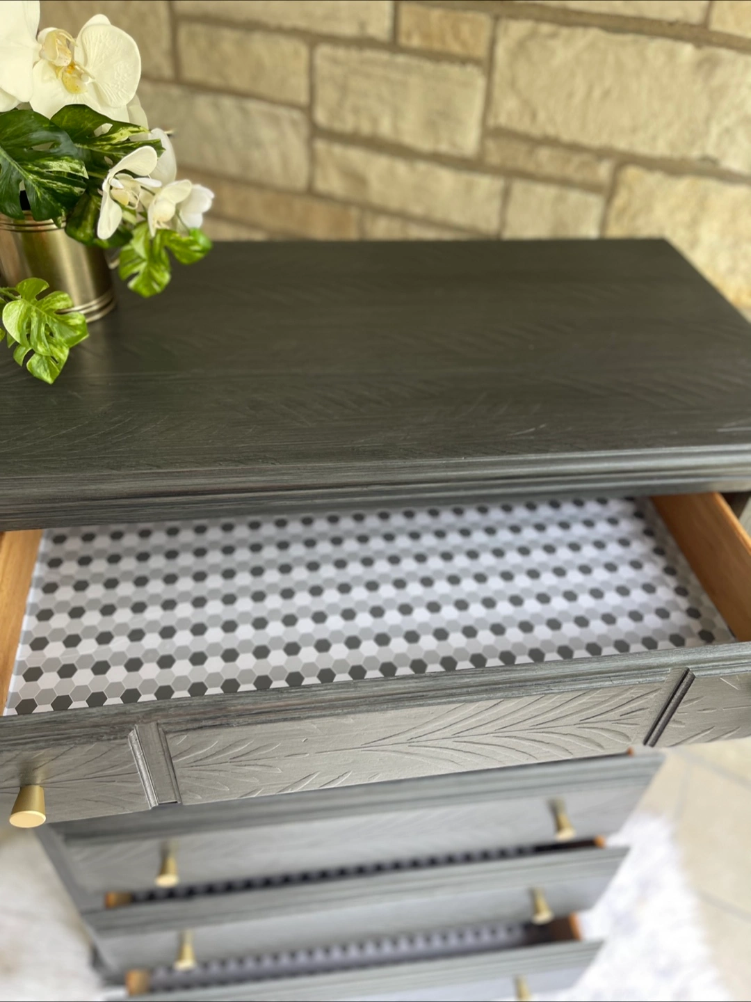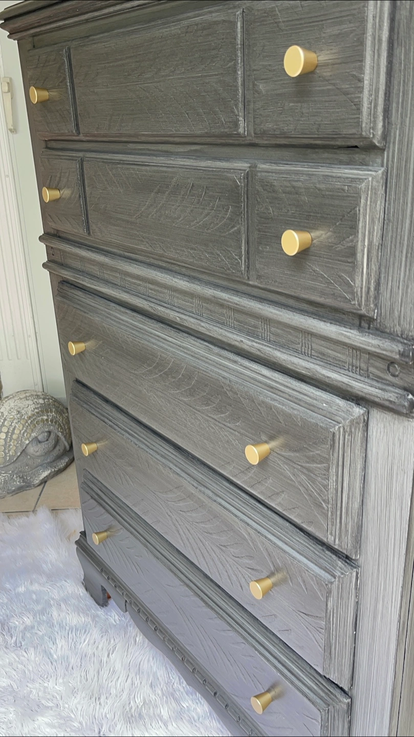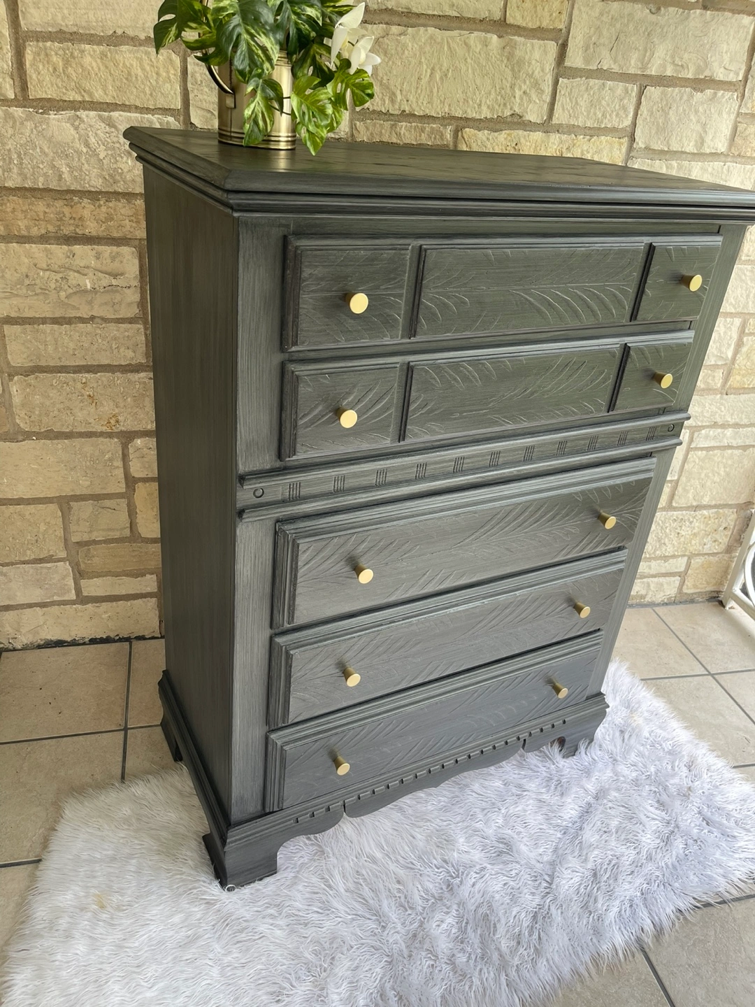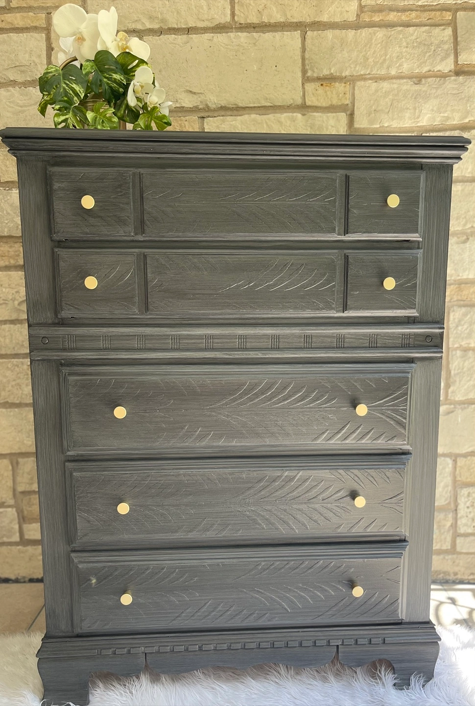 Beautiful 5 drawers dresser redone in modern gray brushed finish. Very versatile piece.