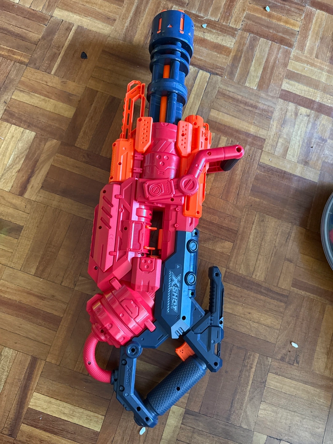 Selling an X-Shot Chaos Meteor toy blaster. It's in great condition and ready for some action-packed fun! The blaster features a cool design with red, orange, and black accents. Perfect for kids and adults alike who enjoy toy blasters
