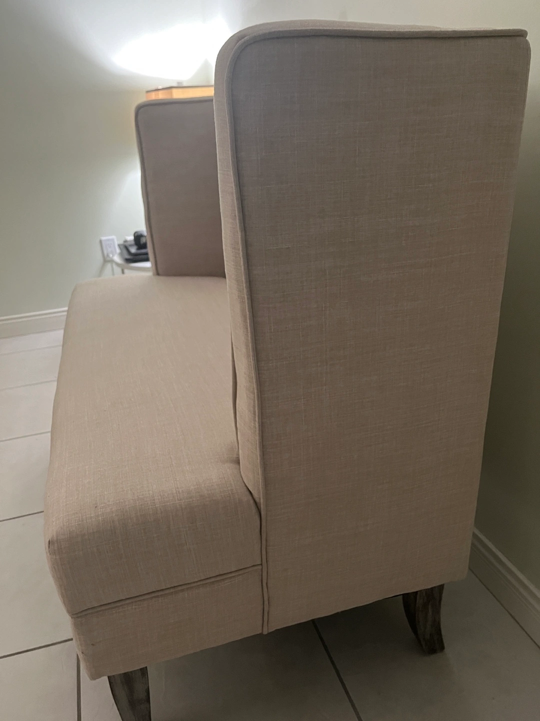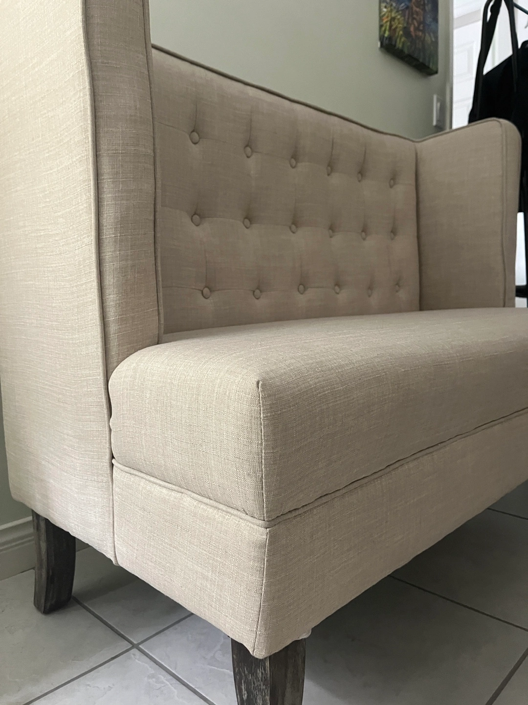 Selling a lovely beige loveseat settee. It's in great condition and would look great in any living room or entryway. The neutral colour makes it easy to match with existing decor. It's a comfortable and stylish piece of furniture!
