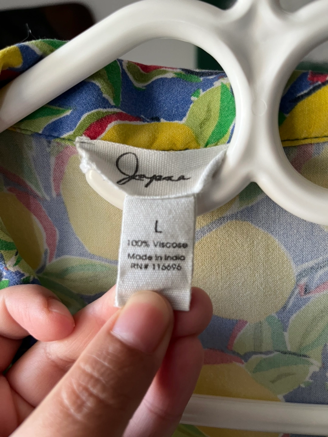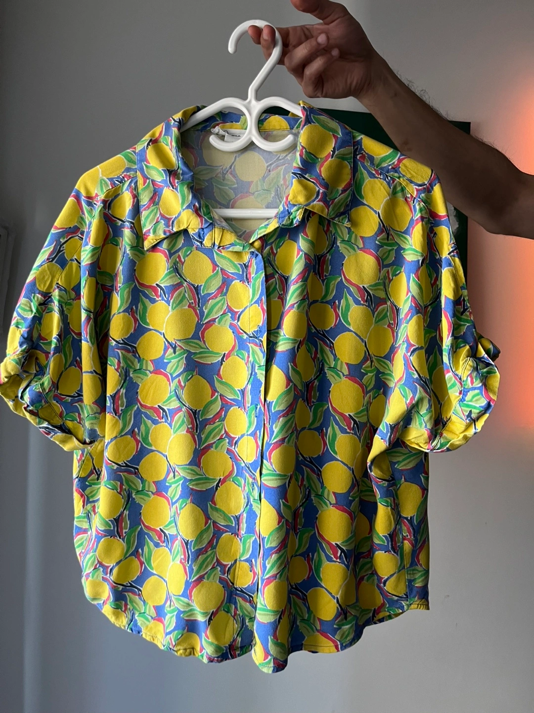 This is a fun and bright blouse for summer. It is of great quality and features a vibrant lemon print on a blue background with red and green leaves. The blouse is super soft and made of 100% viscose and is a size L. It's in great condition and ready for a new home!