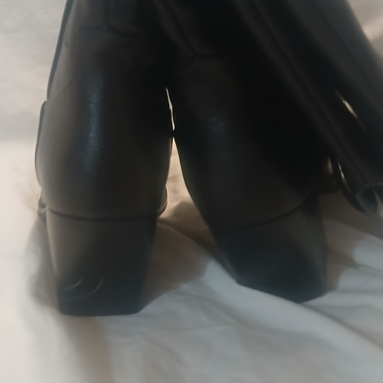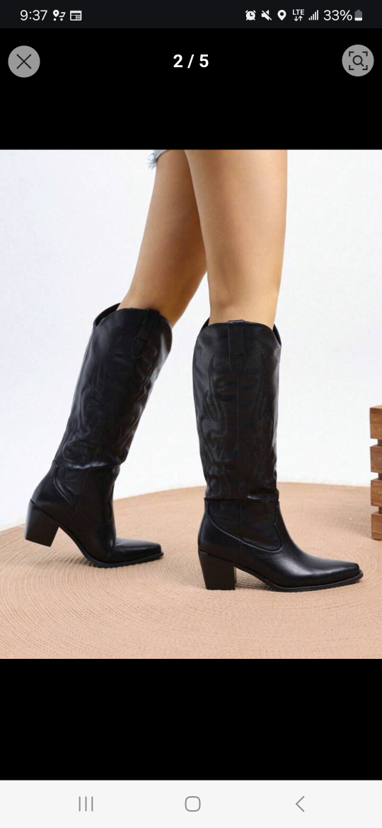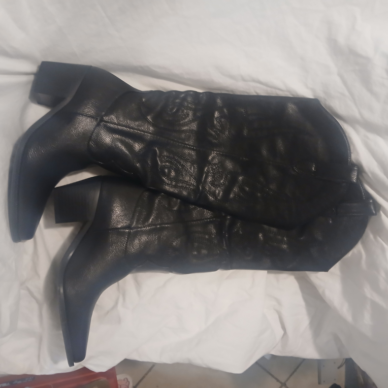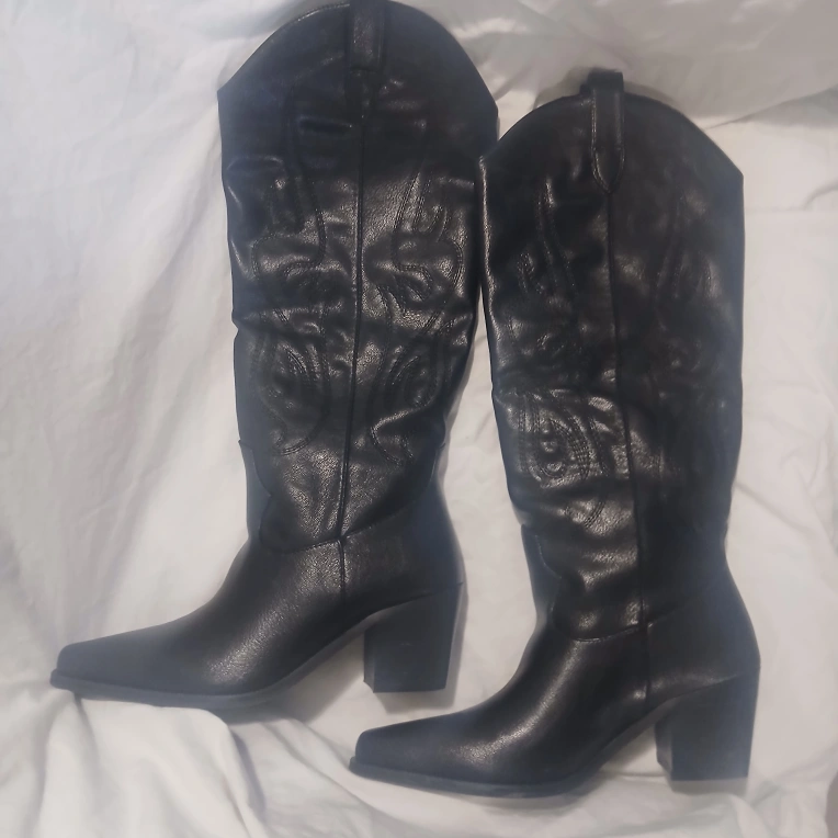 Selling a pair of stylish black cowboy boots in size 6.5.. They have a unique design and are in great condition. Perfect for adding a bit of flair to your outfit! small scuff on back heel.