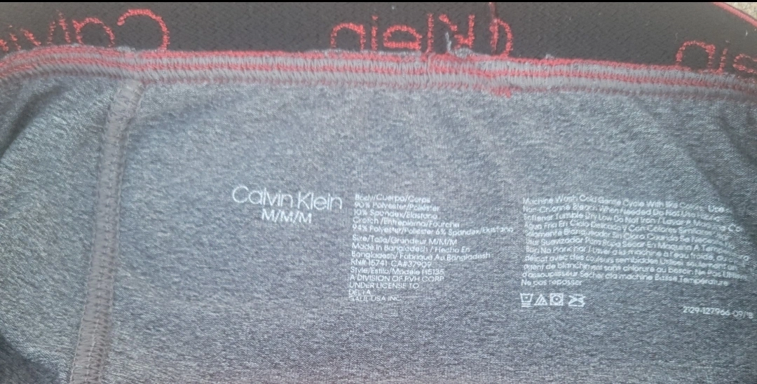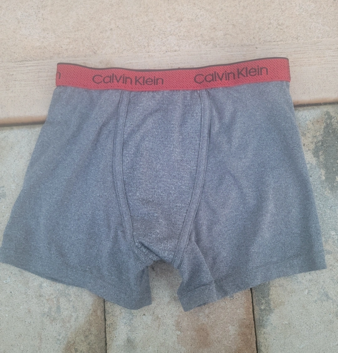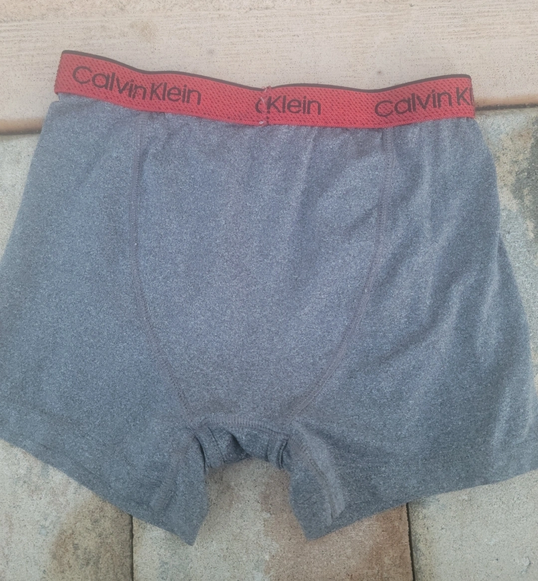 Selling a pair of Calvin Klein boy's boxers in size medium. They are gray with a red waistband. The material is 90% polyester and 10% spandex for a comfortable fit