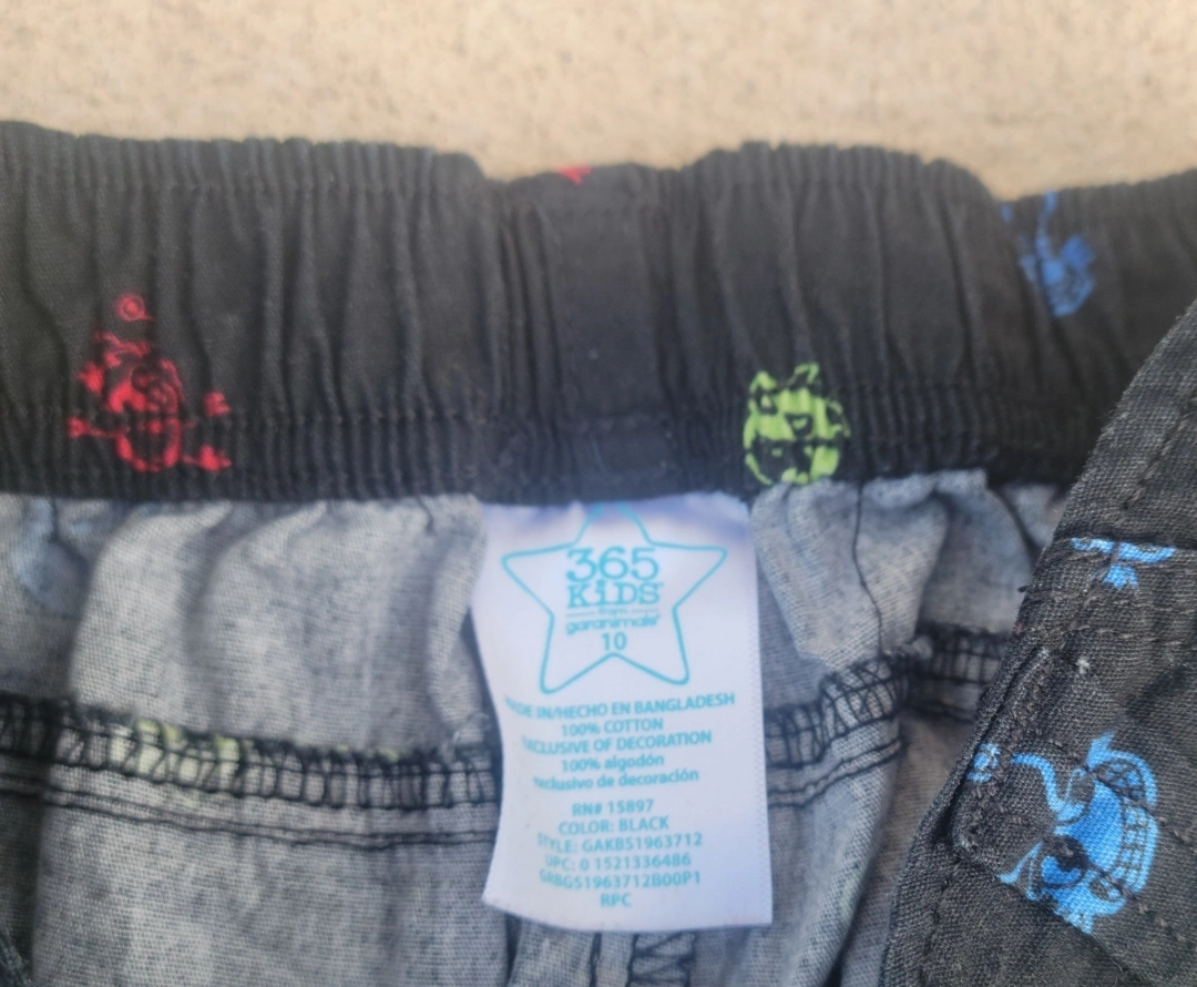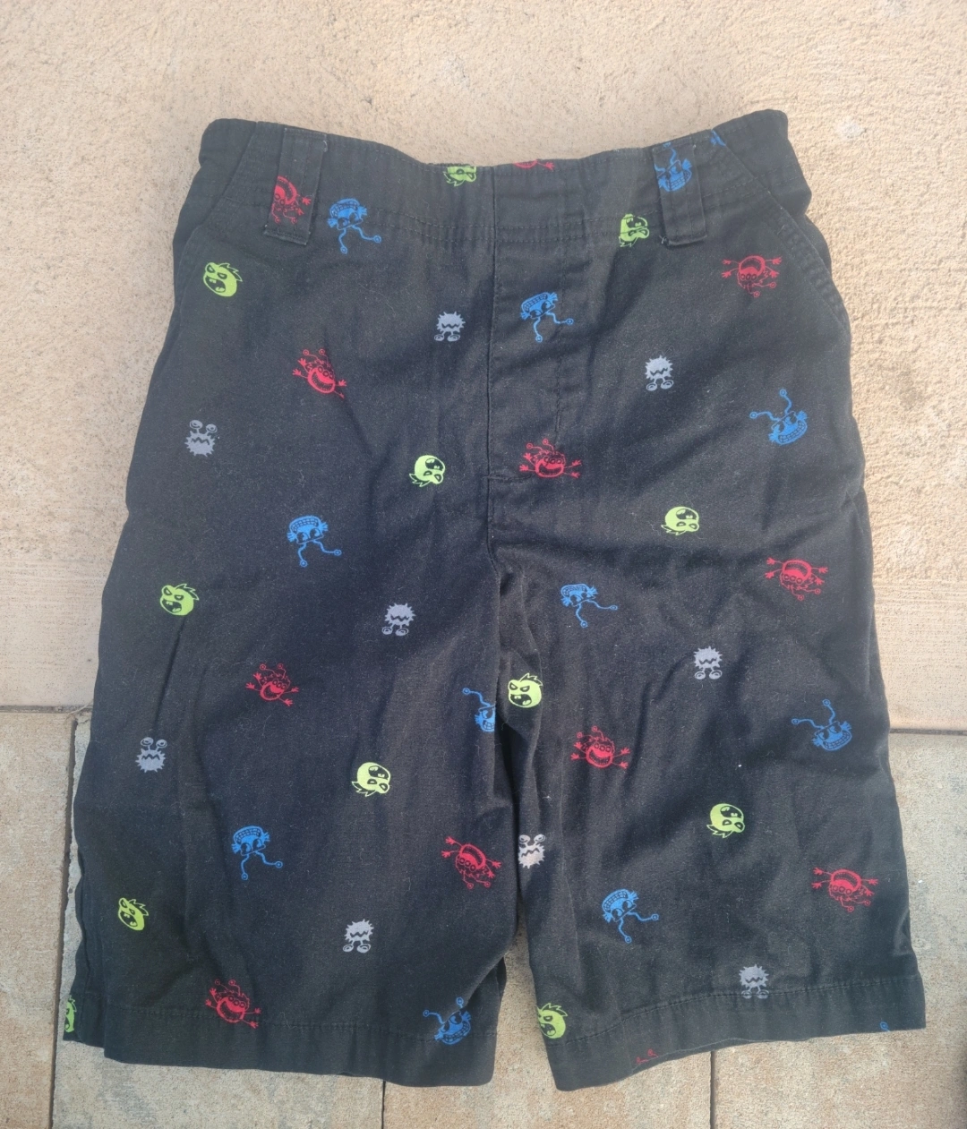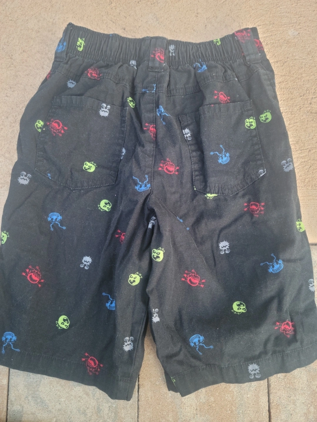 These are a pair of 365 Kids shorts in a size 10. They are black with a fun monster print all over. The shorts are made of 100% cotton.