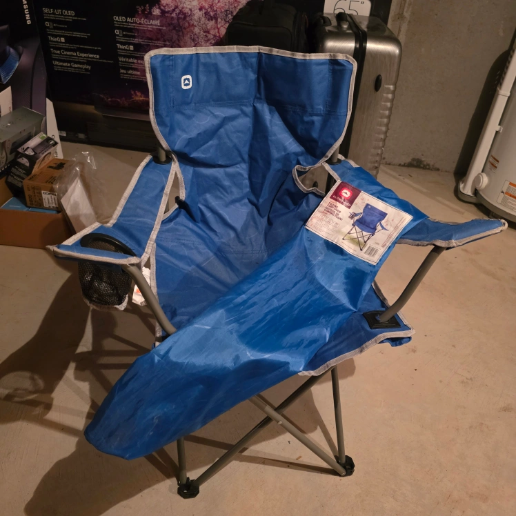 Selling a blue Outbound Deluxe Folding Camp Chair! This lightweight chair is perfect for camping, picnics, or just relaxing in the backyard. It's quick to set up and easy to transport. It can hold up to 225 lbs (102 kg).