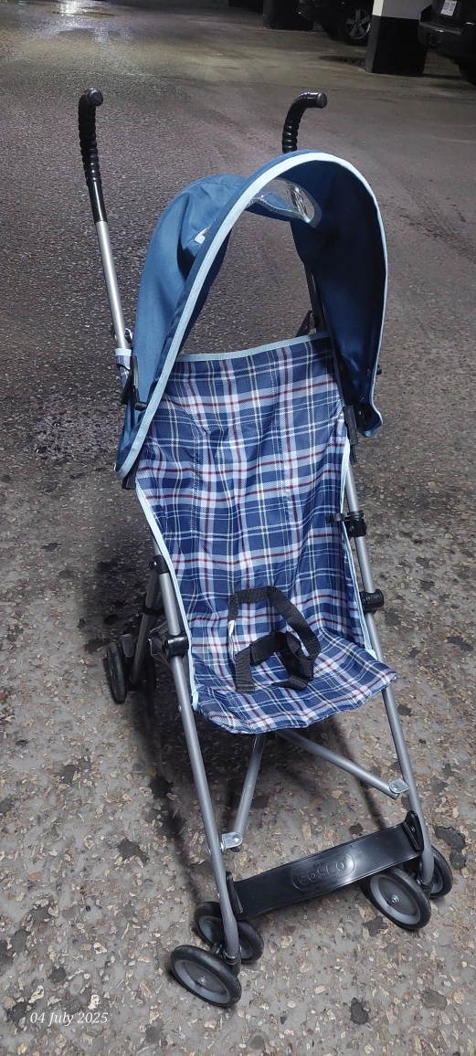 134Selling a Cosco umbrella stroller in a cute blue plaid pattern! It's lightweight and easy to fold, perfect for quick trips. The stroller features a simple harness and a sun canopy to keep your little one comfortable. The date visible in the picture is July 04 2025