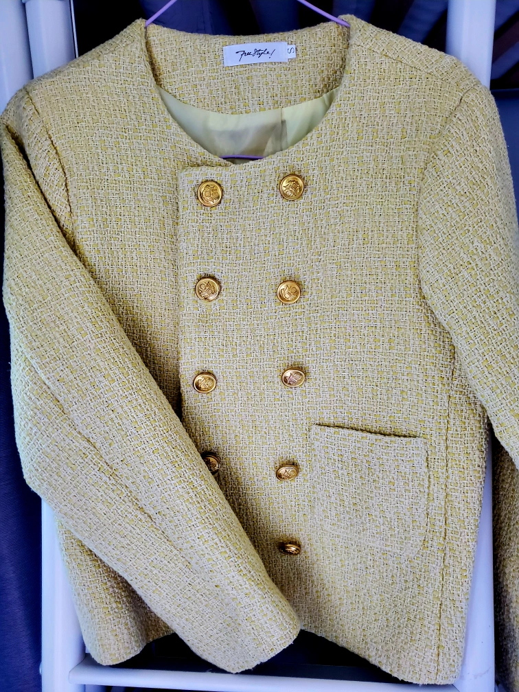 Selling a tweed jacket in size small. It's a light yellow colour with gold decorative buttons. Perfect for spring!