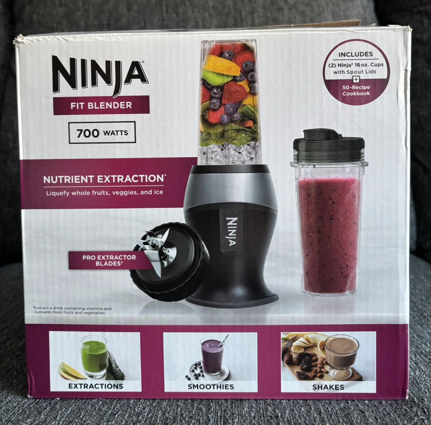 Ninja Fit Blender with 700 watts of power! It's great for nutrient extraction, allowing you to liquefy whole fruits, veggies, and ice. This set includes two 16oz Ninja cups with spout lids and a 50-recipe cookbook to get you started. It also features Pro Extractor Blades for efficient blending.