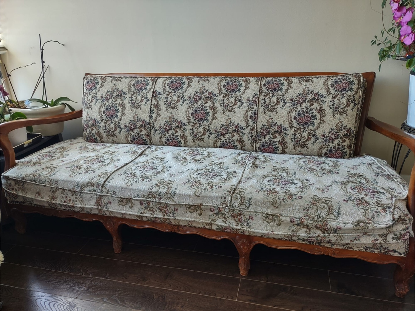 Posting for a friend. A vintage sofa and two matching chairs. The set features a beautiful floral pattern on the fabric and a classic wooden frame. Perfect for adding a touch of elegance to your living room. Steeles and Dufferin, Lana: +1 (647) 447-9150