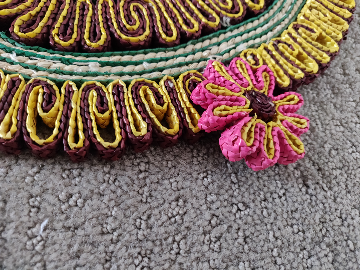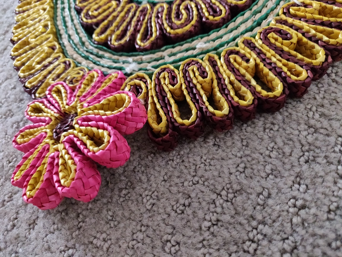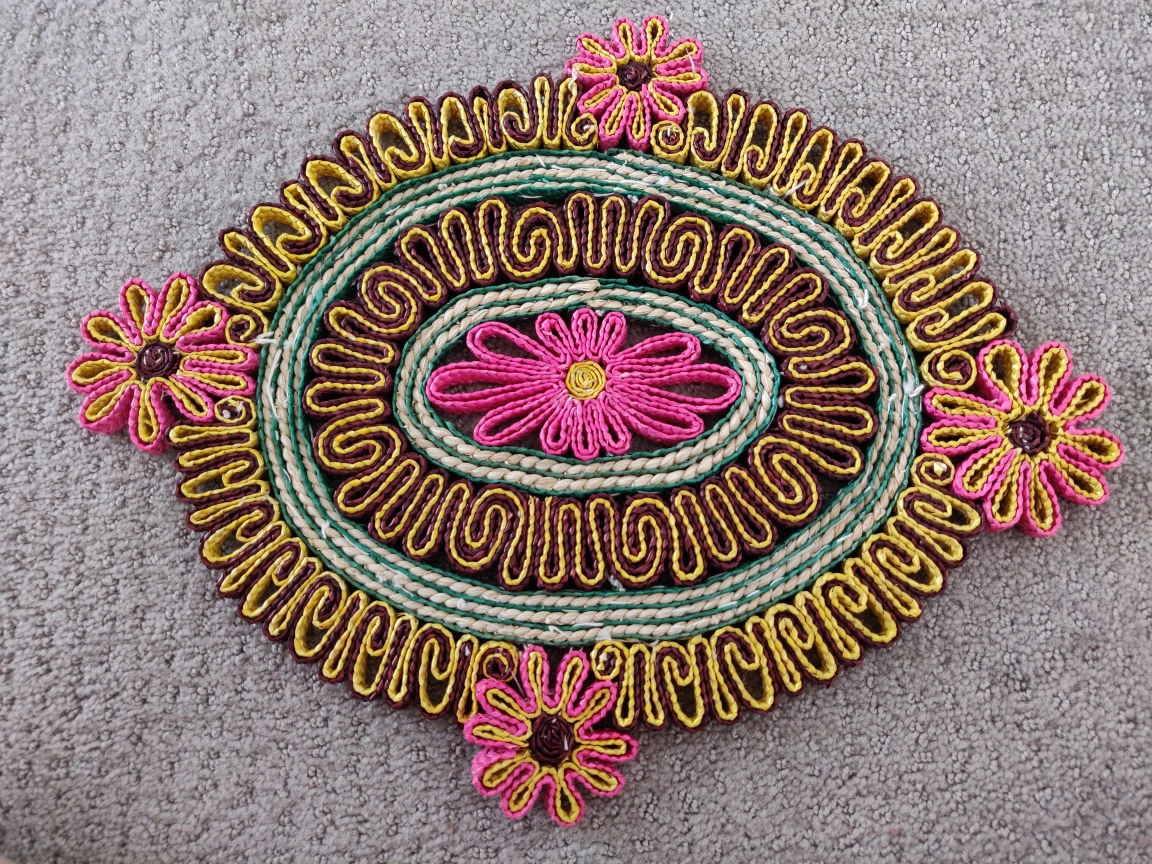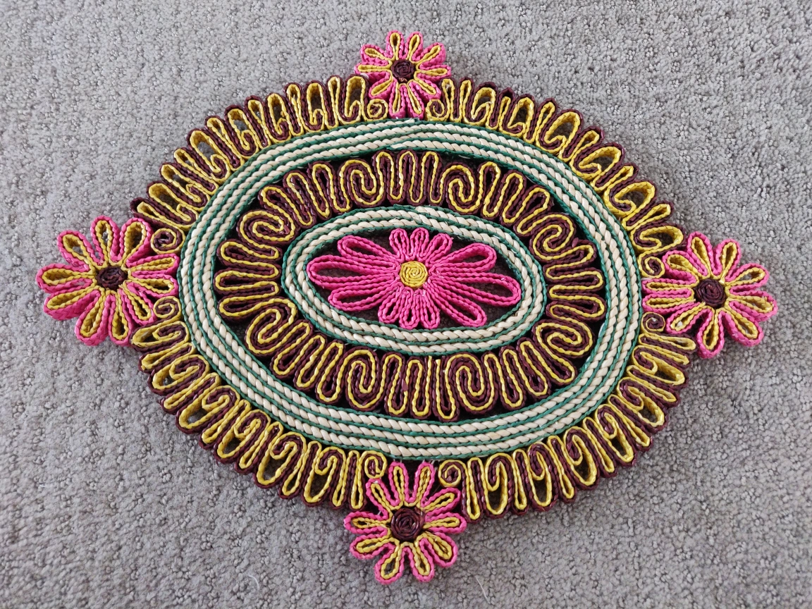 I am selling Braided Hot Pads / Trivets / Placemats in great condition. For hot dishes, woven hot pads for dining tables, kitchen dishes, coasters, placemats, or potholders. Use to protect your wood or granite table from heat and scratches effectively. Bring a touch of vibrant, bohemian style to your home with this beautiful, handcrafted braided hot pad trivet. Made from intricately braided cord rope, this piece features a colorful design with charming flower accents. It's the perfect way to protect your dining table, countertop, or kitchen island from hot dishes, scratches, and spills.