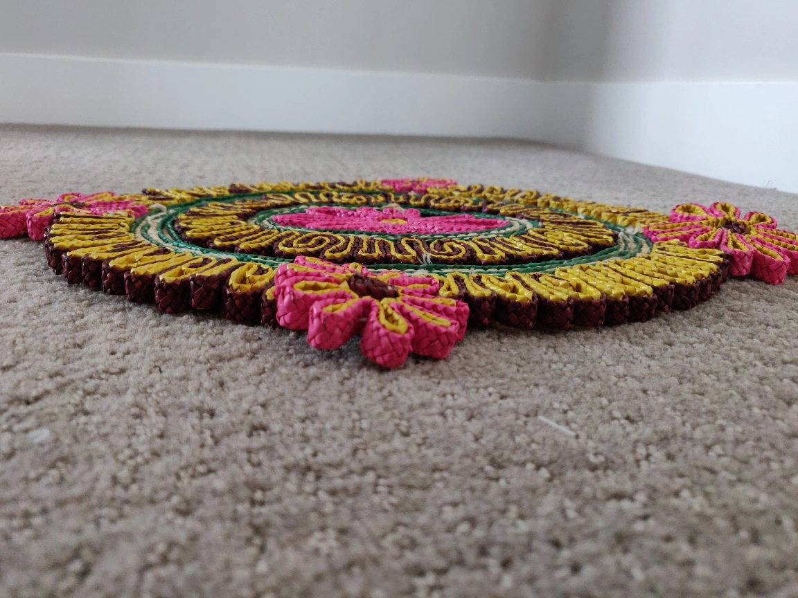 NOTE: As shown in the attached pictures, two of the flowers on the edge each have a single petal that is hanging by a thread on the trivet. This is a minor flaw that does not affect the function of the overall piece.