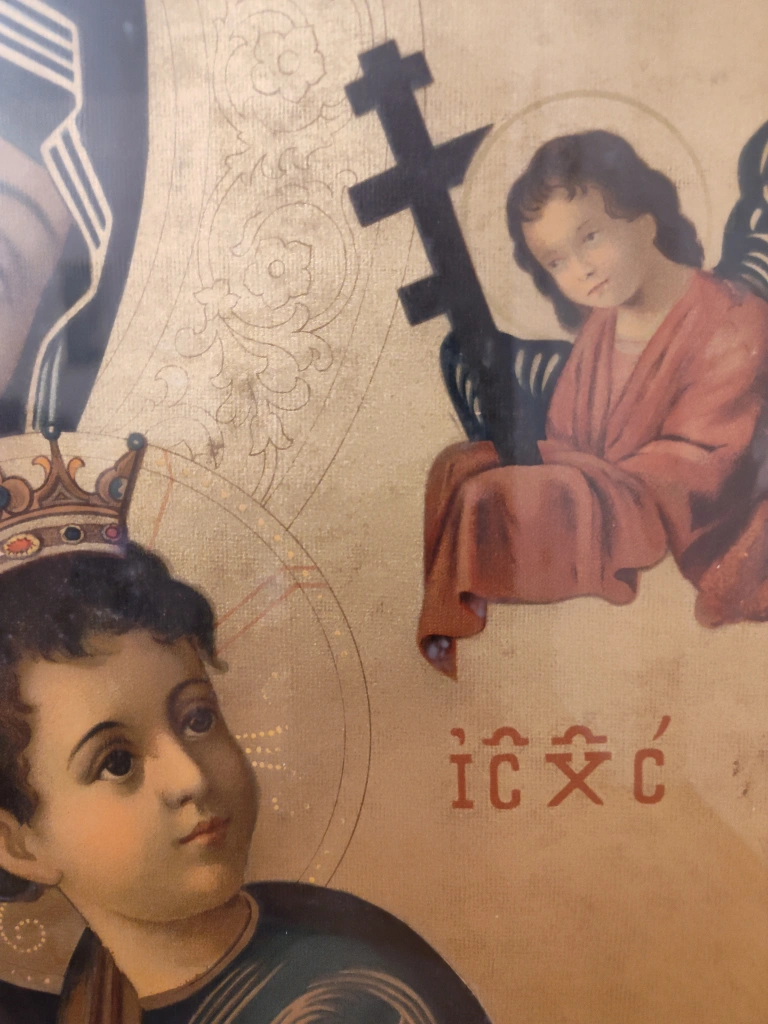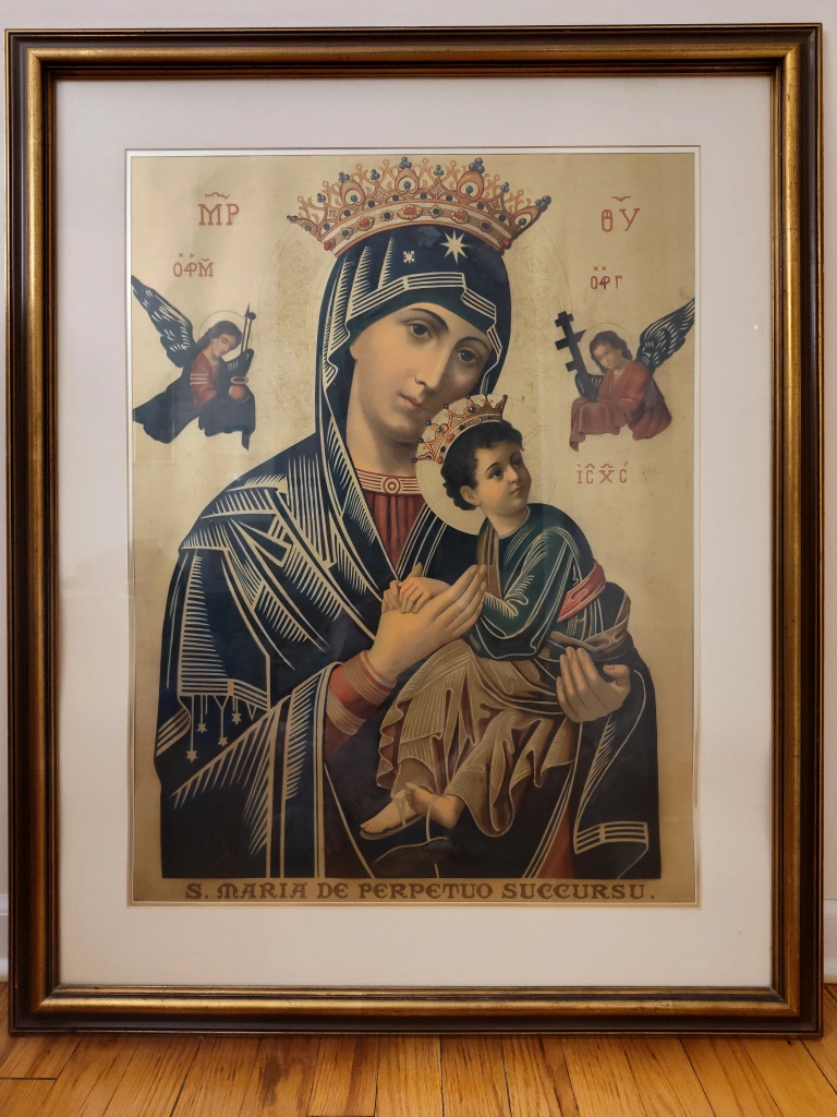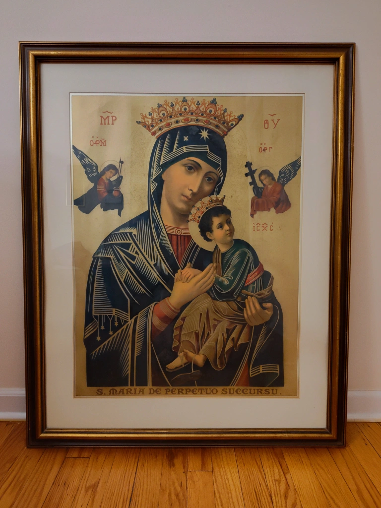 Here's a large framed lithograh print of S. Maria de Perpetuo Succursu (Our Lady Of Perpetual Help). It's a beautiful piece ready to add a touch of classic art to your space. With the frame it measures