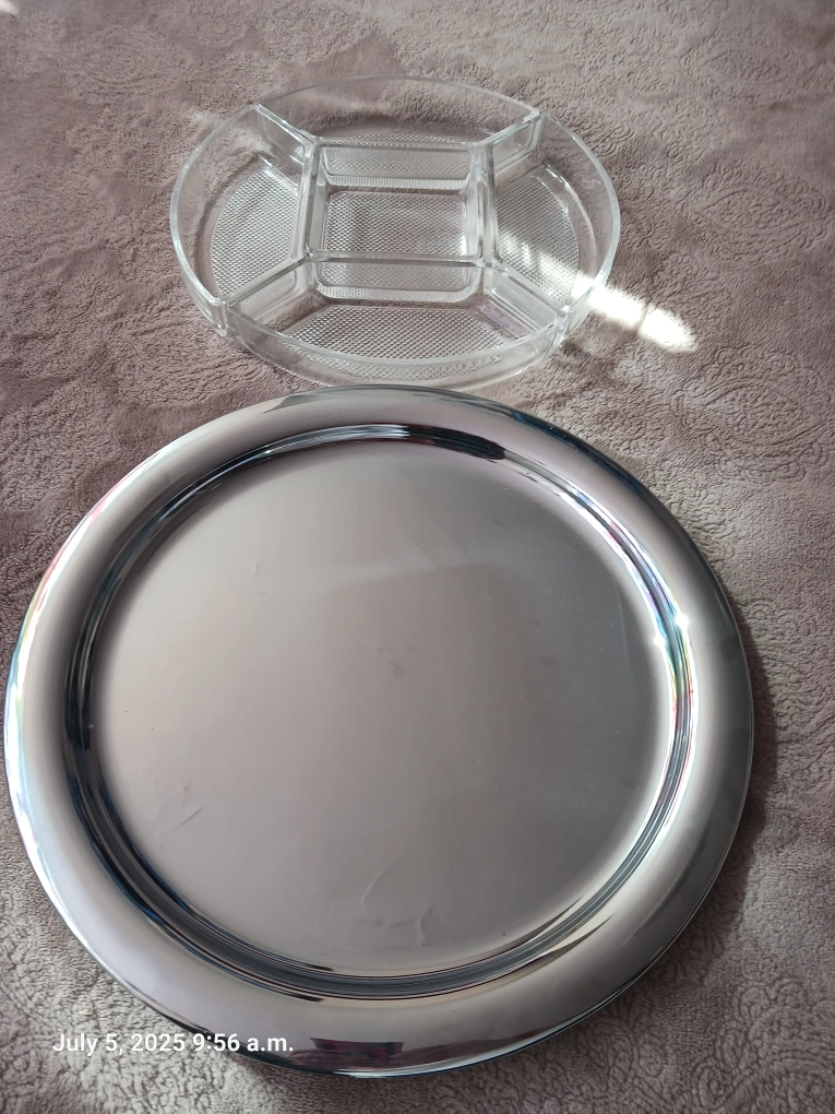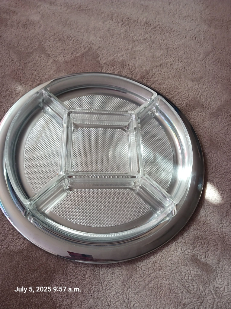 Selling a lead crystal serving tray with a silver finish and a clear divided lid. Perfect for serving snacks or appetizers at your next gathering! The dishes help to keep food fresh and organized. It's in great condition and ready for a new home. serving dishes with silver tray. This is about 45 years old from Birks store.