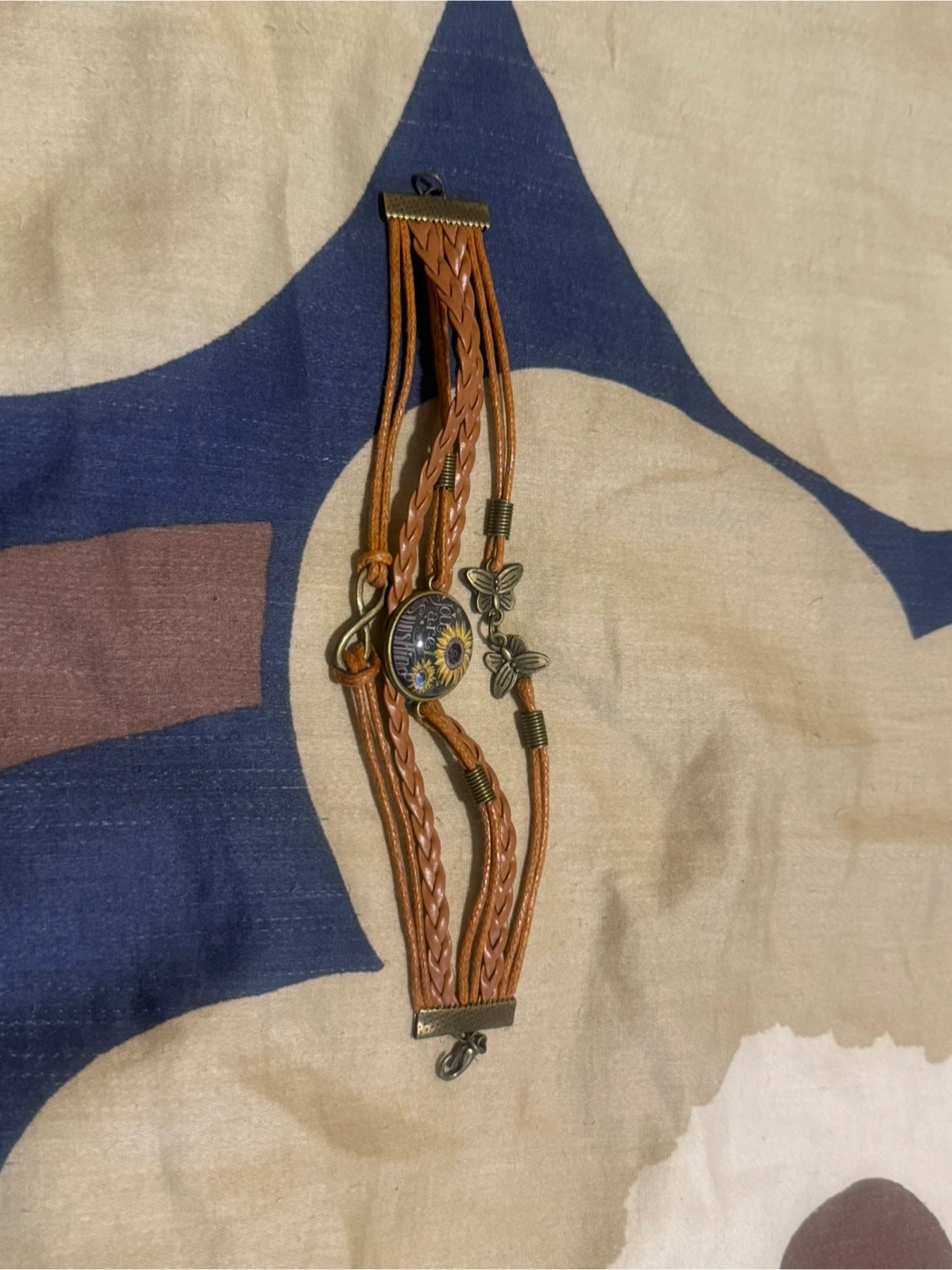 Here's a cute brown braided bracelet! It features a sunflower and butterfly design. It's in great condition and would make a lovely addition to any outfit