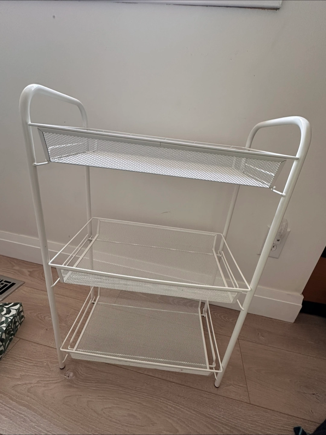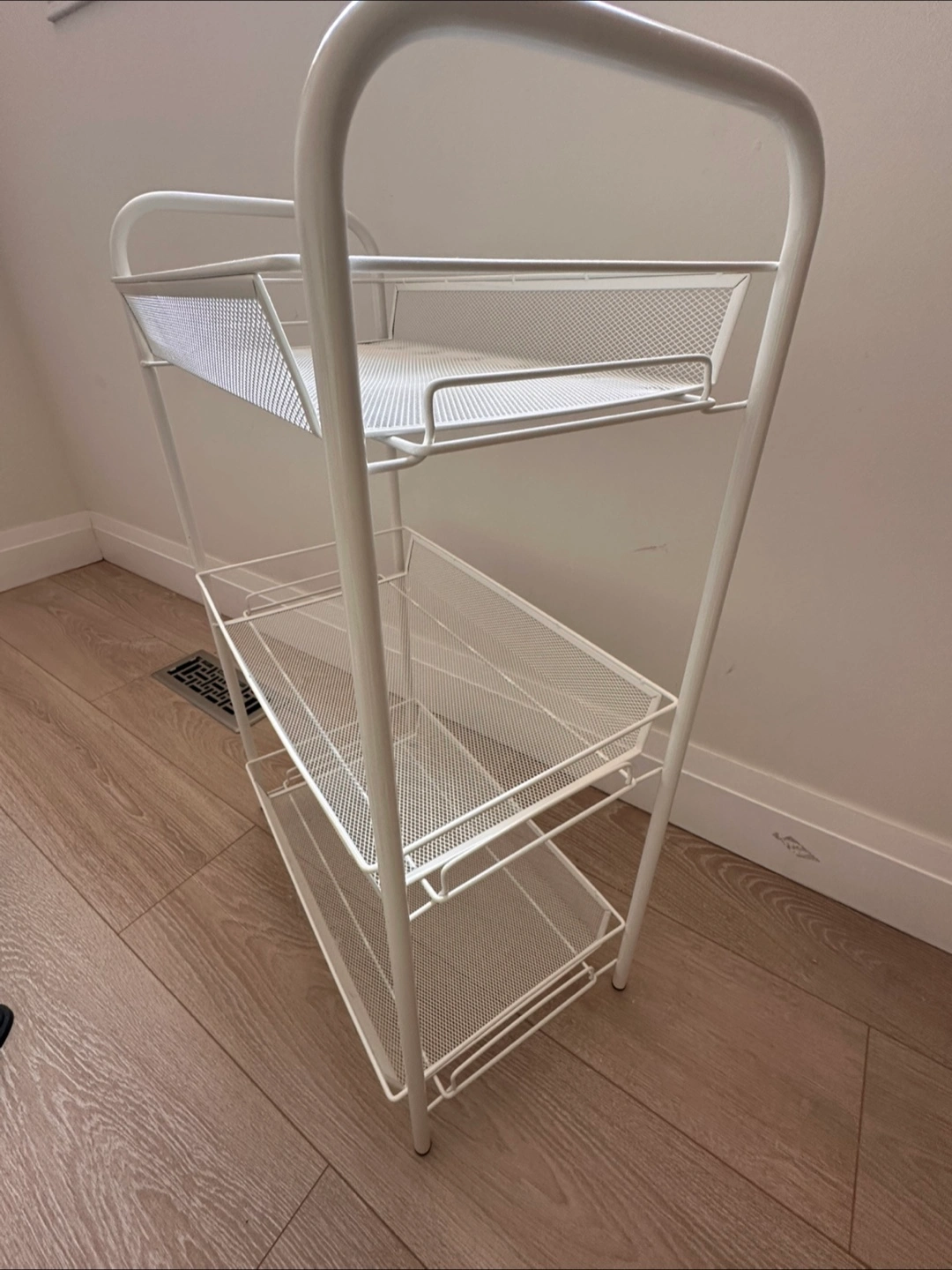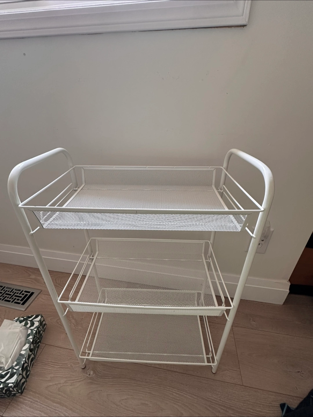 Selling a handy white metal utility cart! It has three shelves, perfect for extra storage in the kitchen, bathroom, or anywhere.