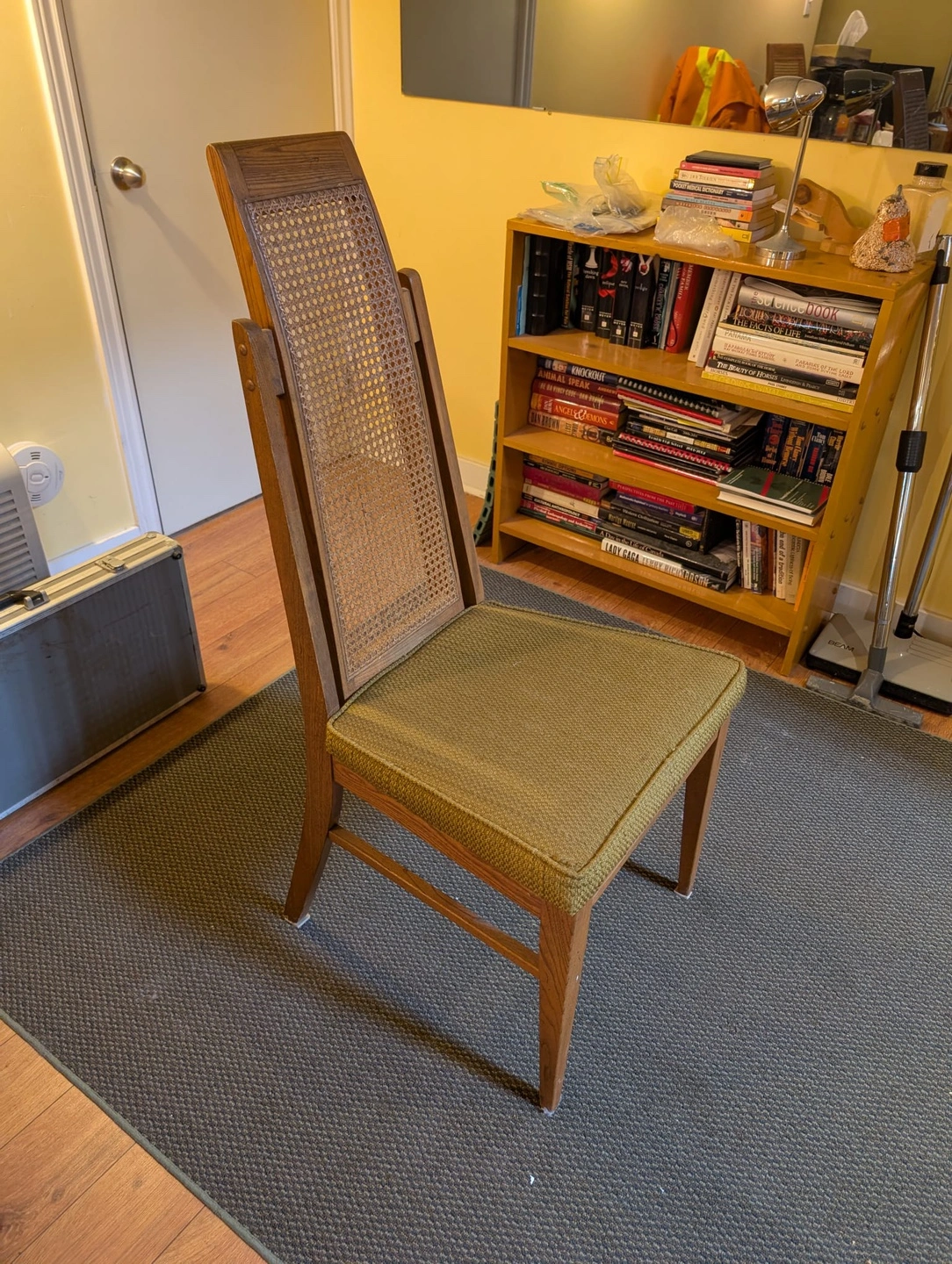 Selling 5 vintage wooden dining chair with a rattan back and green cushion.