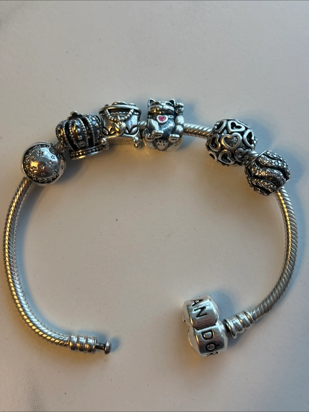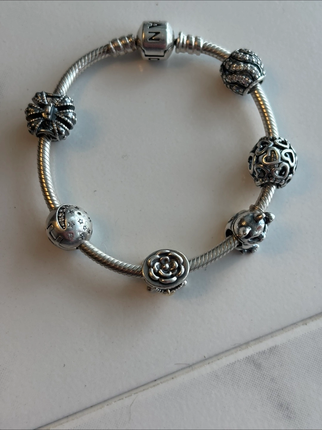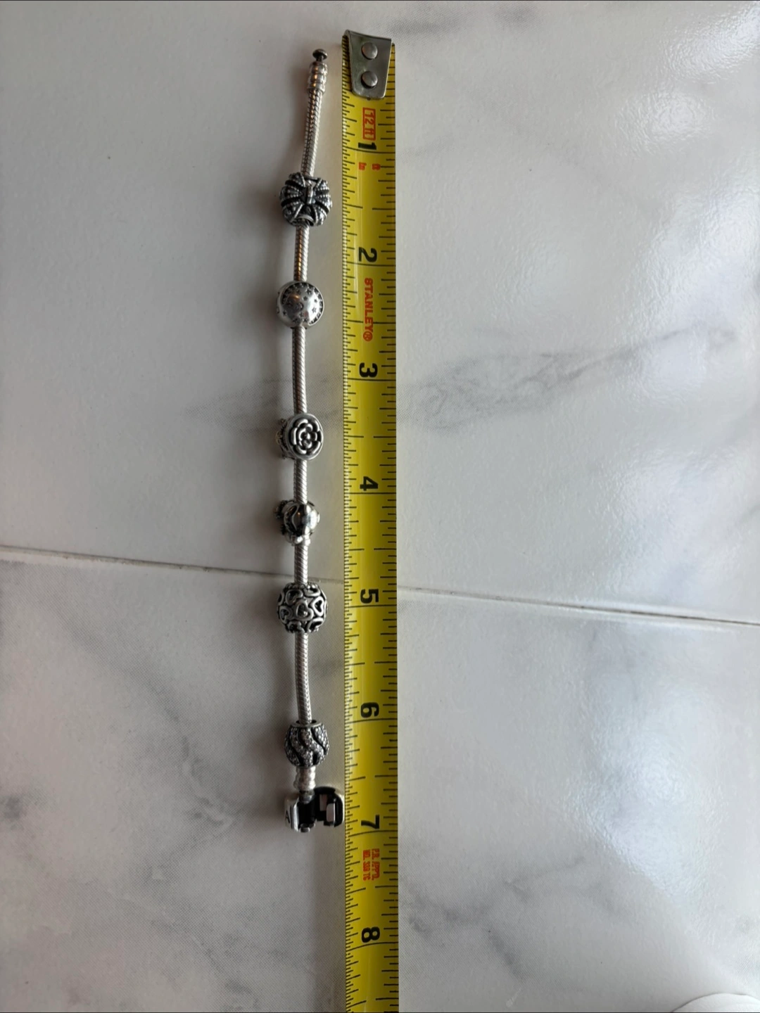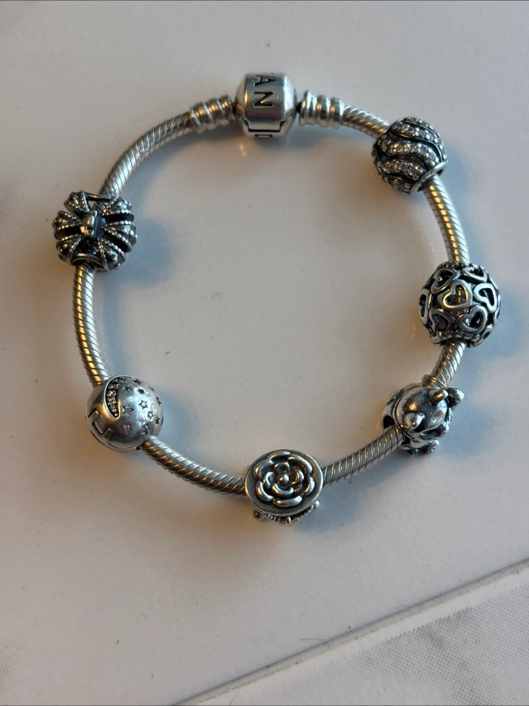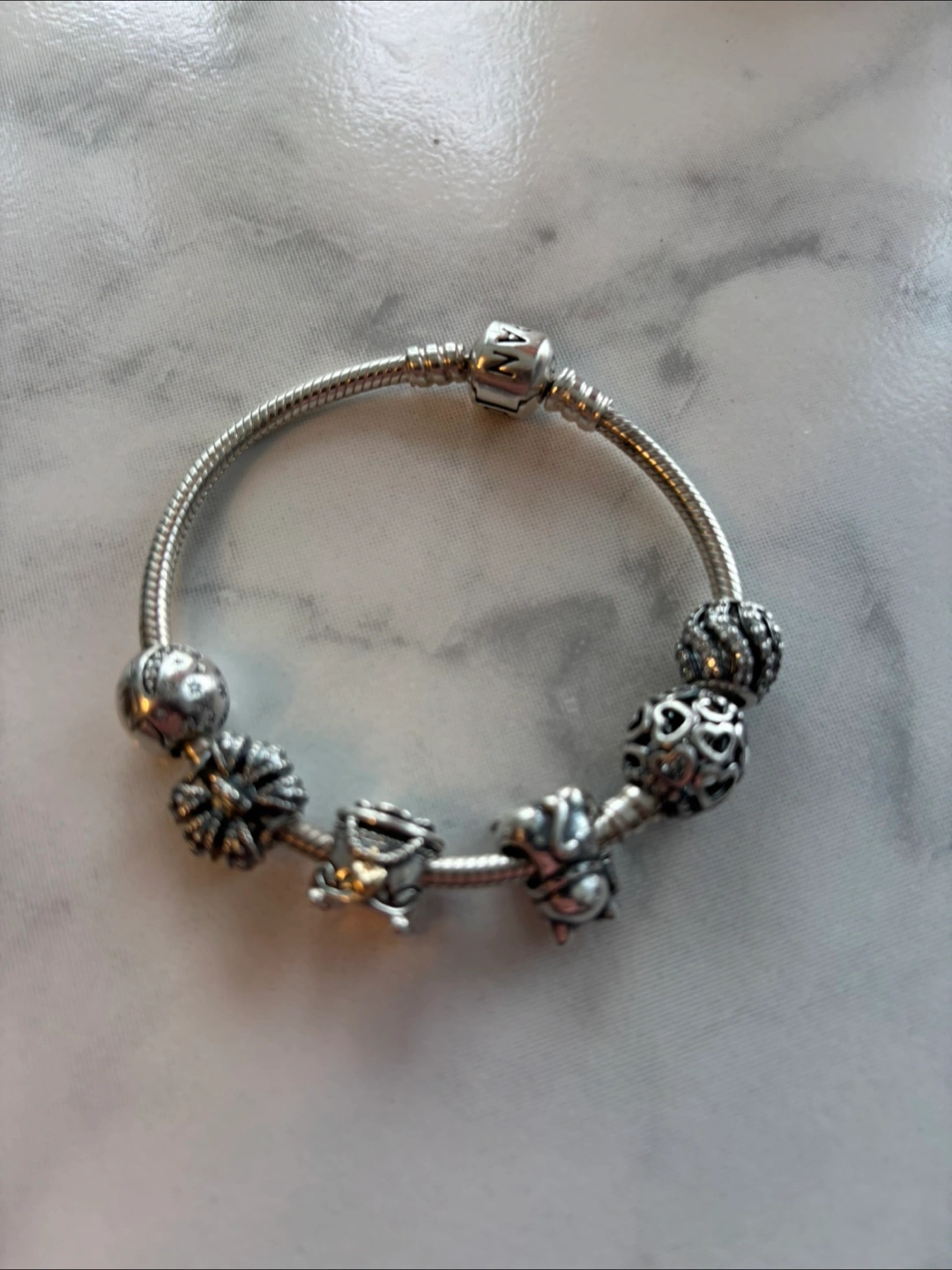 Selling a lovely Pandora bracelet! It's silver and comes with a variety of cute charms. The bracelet measures about 7.5 inches in length. Perfect for adding to your jewelry collection!