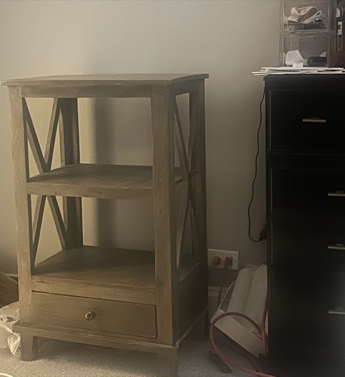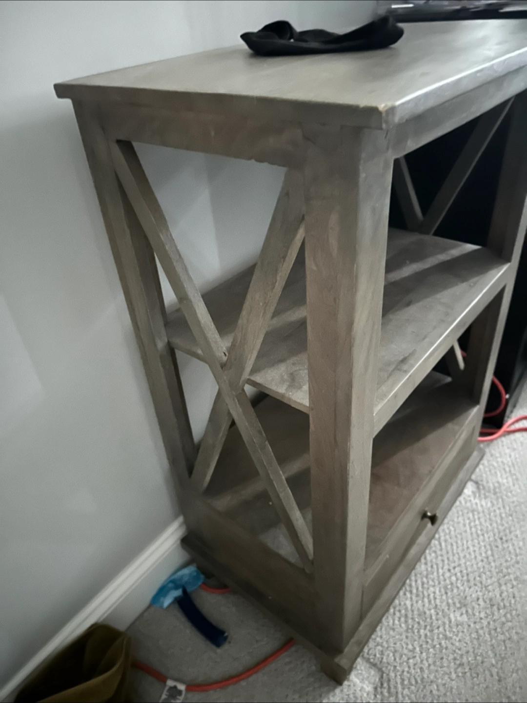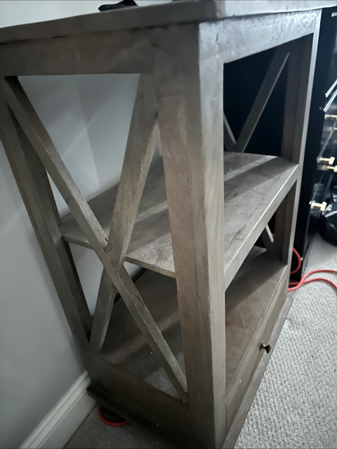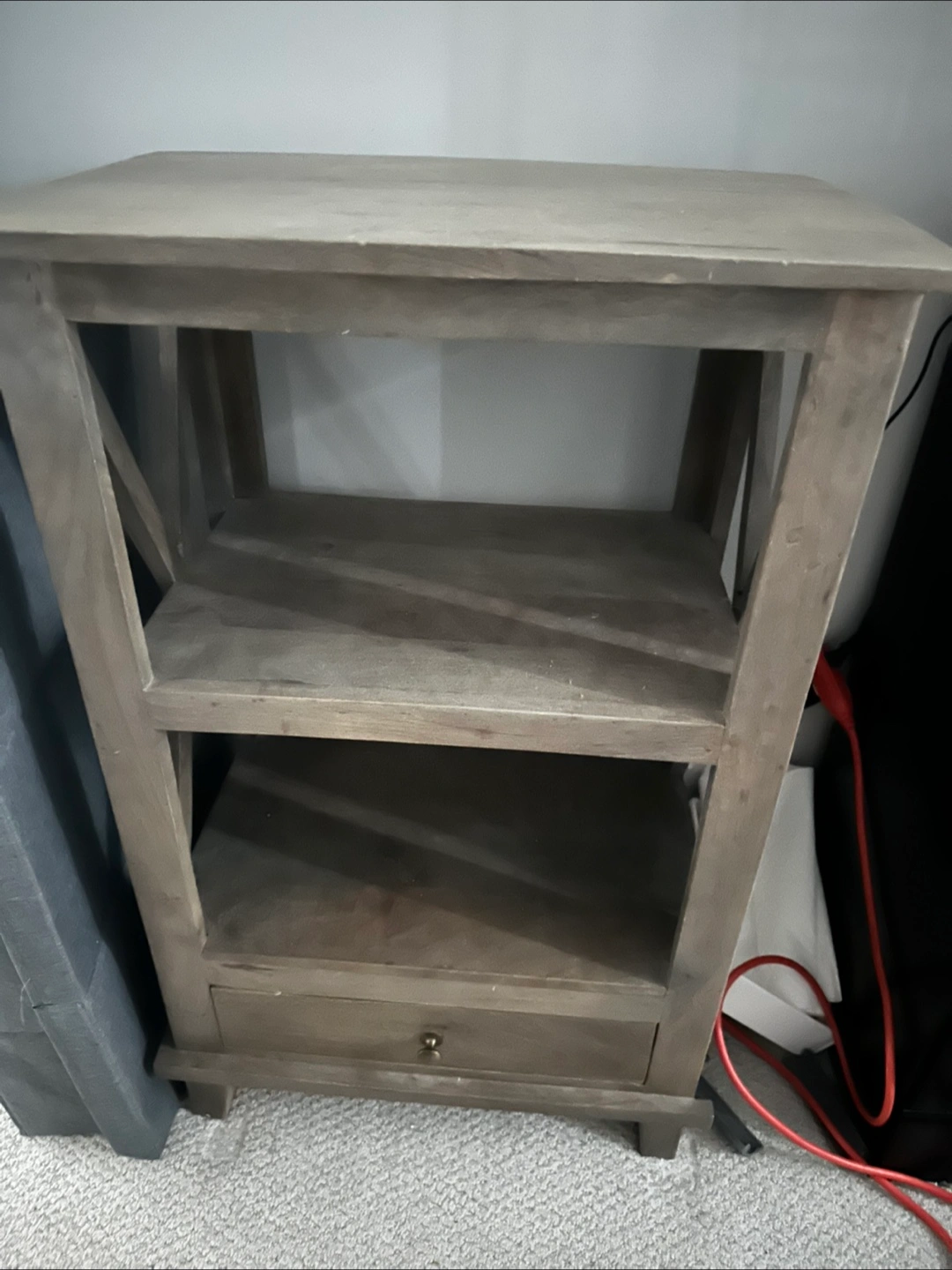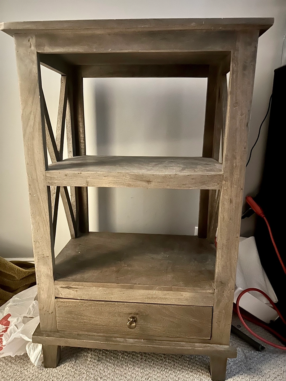 This is a wood end table that features a drawer and two shelves. It has a rustic look with an X design on the sides. Perfect for a bedside table or as a side table in a living room