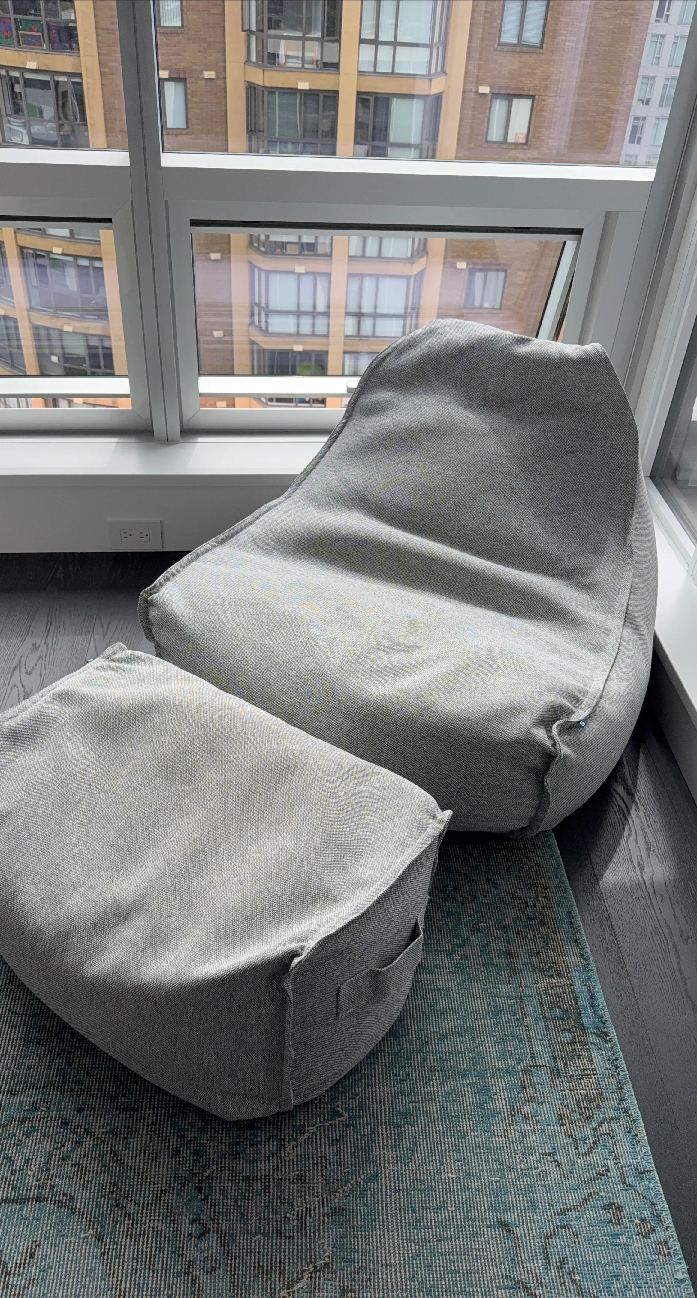 Selling a comfy grey bean bag chair with a matching ottoman. It's in great condition and perfect for relaxing!