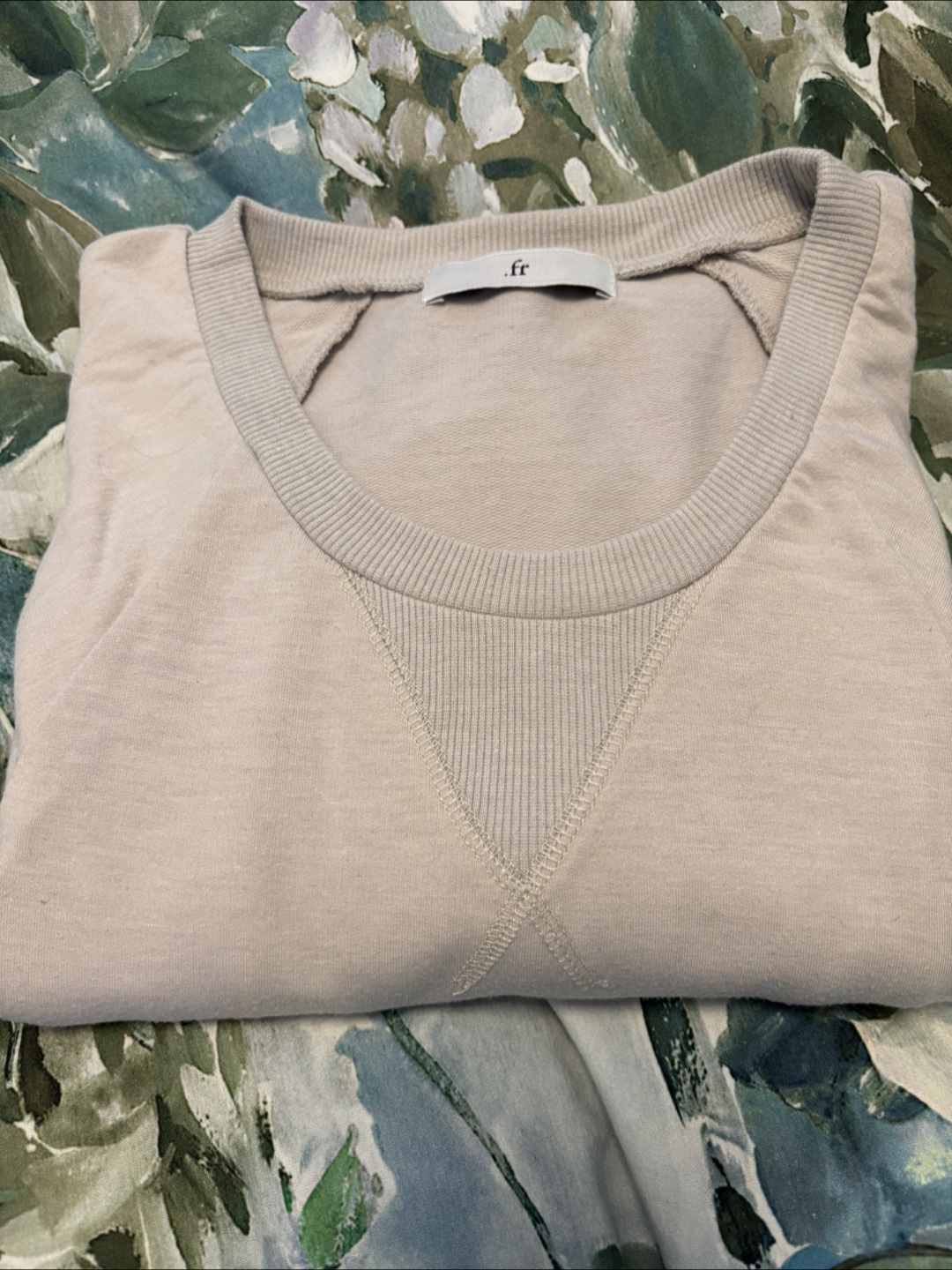 Selling a styling .fr beige long sweatshirt in size M. It's made of 60% polyester, 35% cotton, and 5% polyurethane.