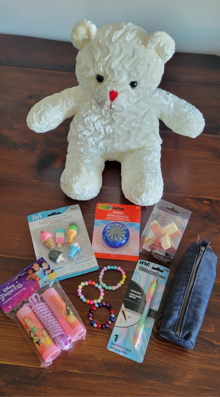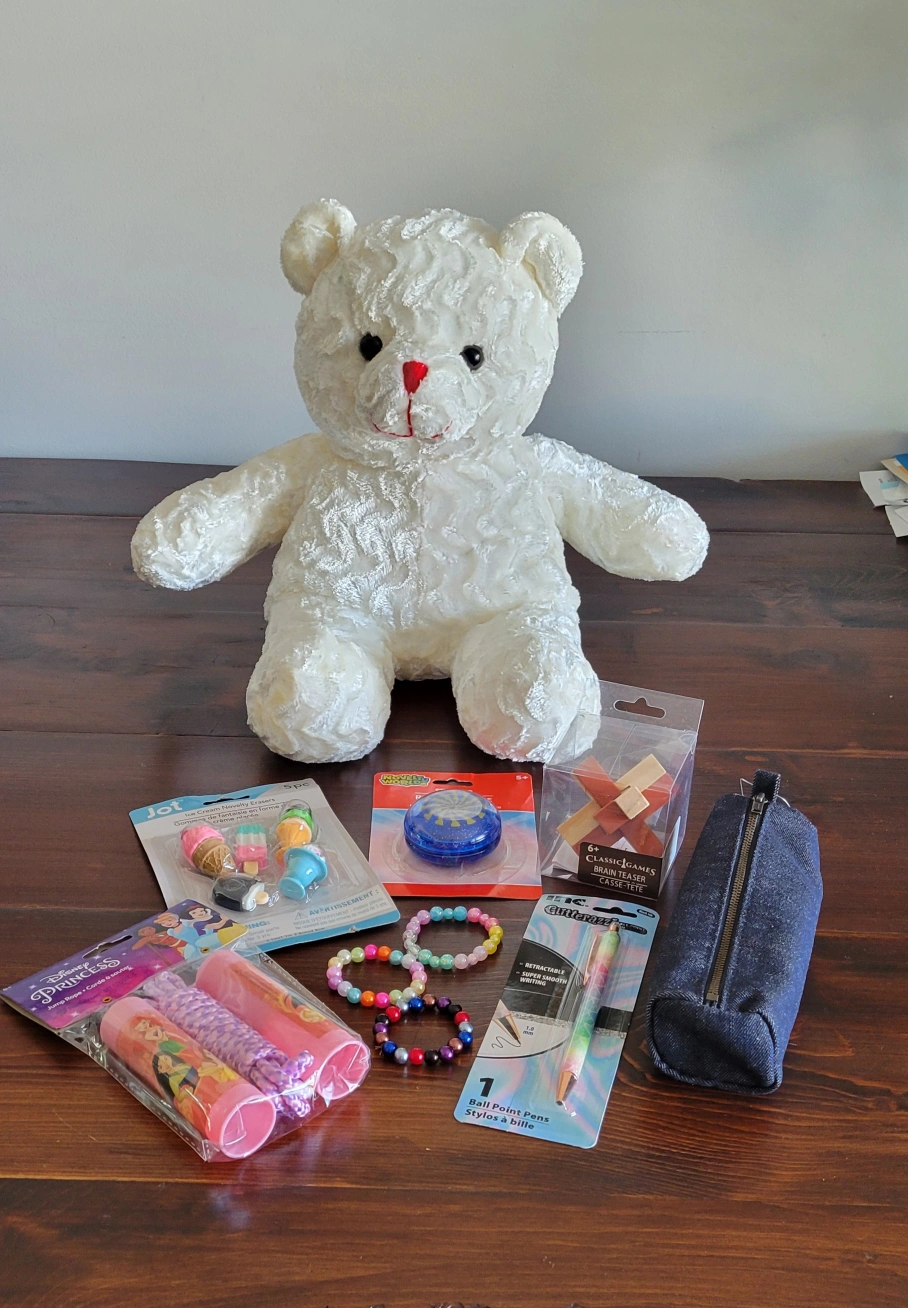 Giving away a mixed lot of fun items! Includes a cute teddy bear (good condition), some colourful bracelets, a unused pen, and other small toys and accessories. Good for kids 5-6 yo. Pickup only at Brimley and Eglinton Rd in Scarborough