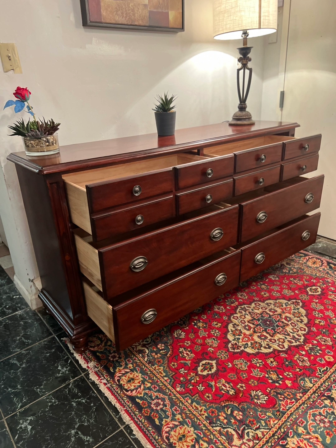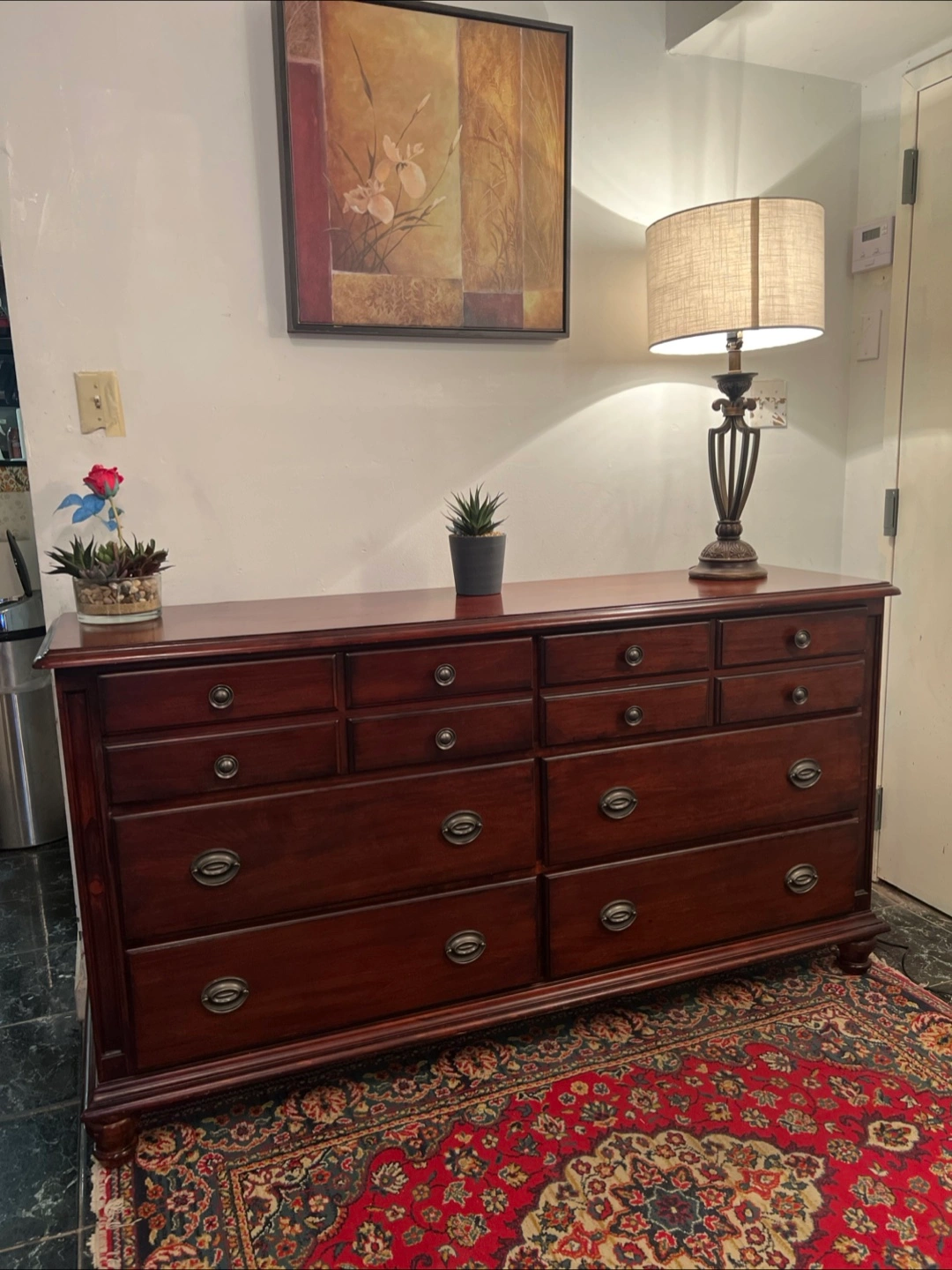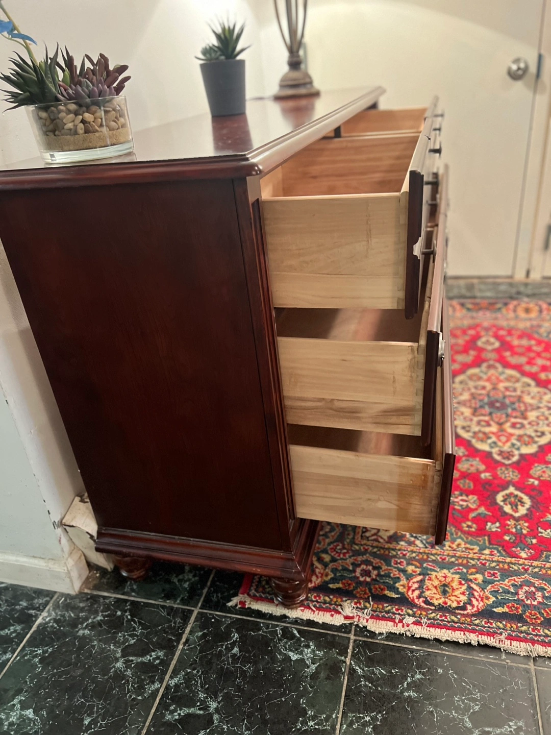 415For sale: a classy wooden six-drawer wide dresser. The exterior is in great condition, though there may be some minor, unnoticeable cosmetic wear. The interior drawers are in mint condition and very clean. This dresser is both sturdy and functional. Measurements: 18” D x 64” W x 34.5” H Delivery is available for an additional fee, which will depend on your location. Payment can be made via cash, Venmo, Zelle, CashApp, or PayPal.