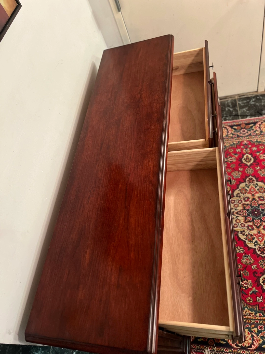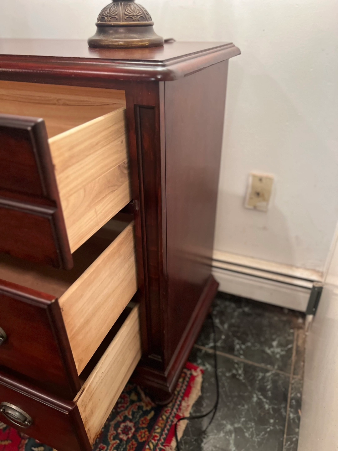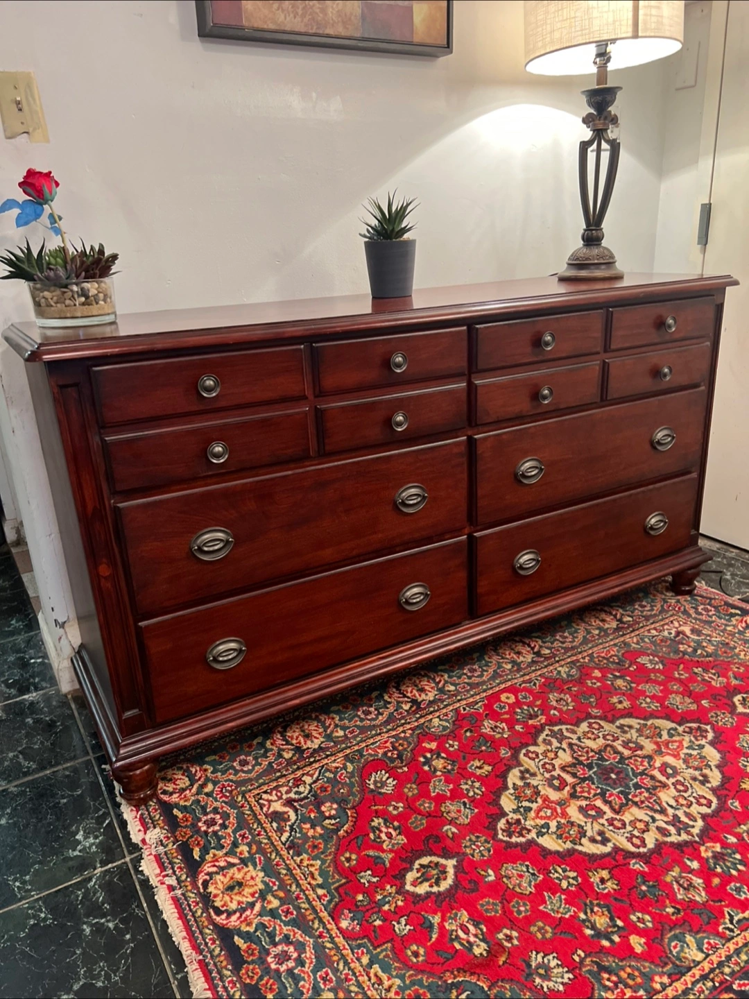 415For sale: a classy wooden six-drawer wide dresser. The exterior is in great condition, though there may be some minor, unnoticeable cosmetic wear. The interior drawers are in mint condition and very clean. This dresser is both sturdy and functional. Measurements: 18” D x 64” W x 34.5” H Delivery is available for an additional fee, which will depend on your location. Payment can be made via cash, Venmo, Zelle, CashApp, or PayPal.