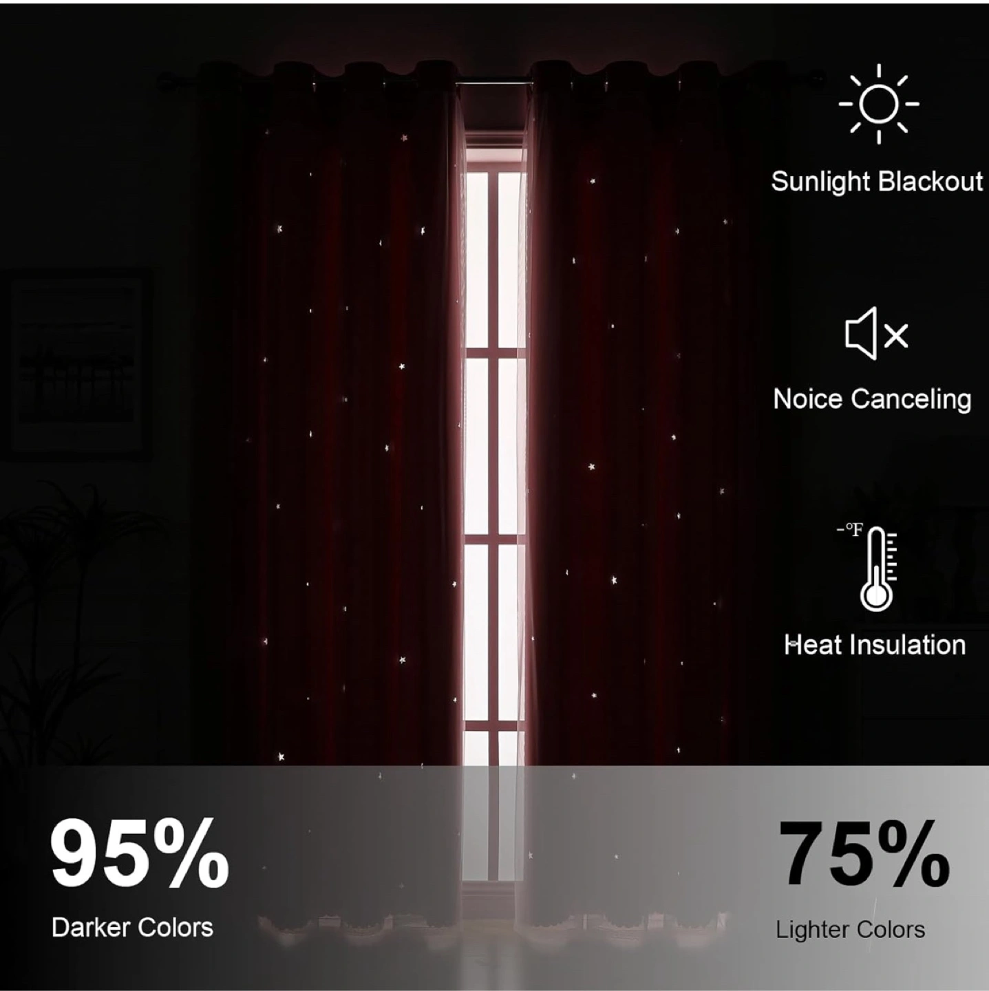 They feature a high-density shading material and premium netting for a beautiful layered look. The curtains also have stainless steel metal grommets, making them easy to hang on any standard curtain rod