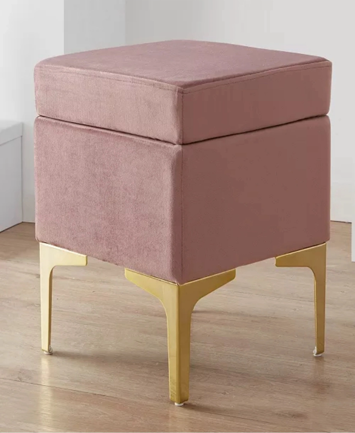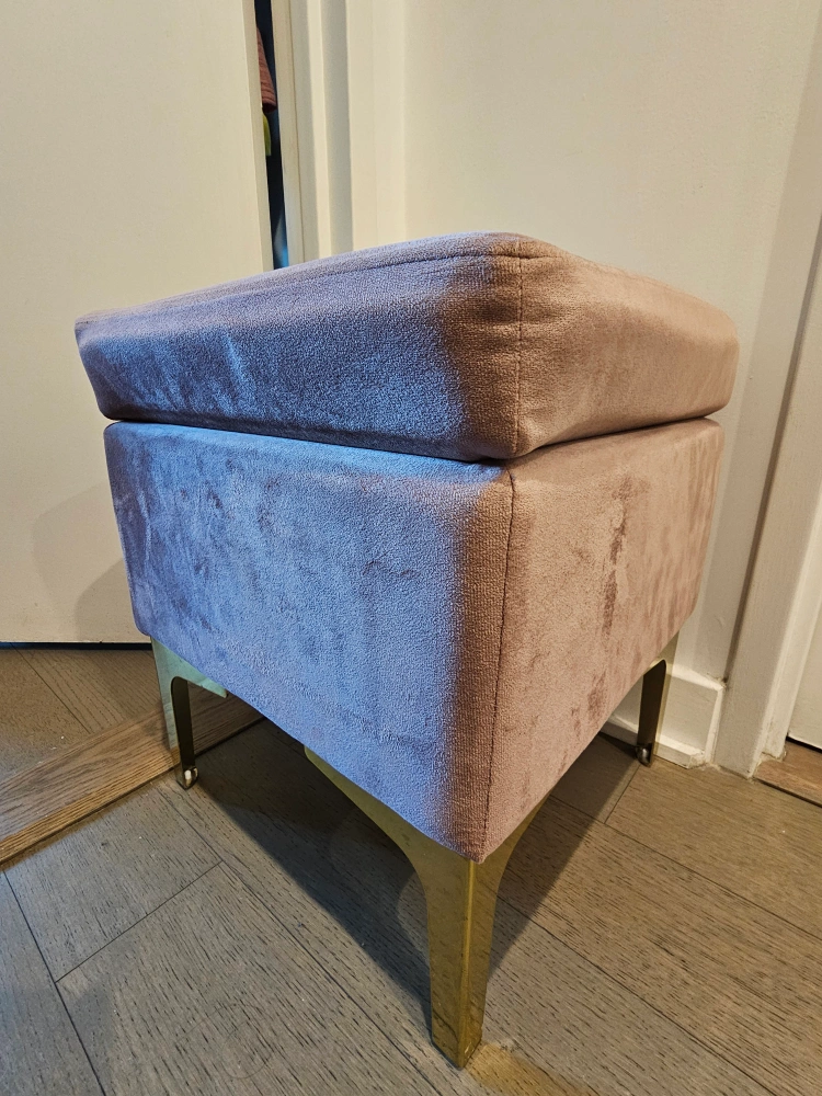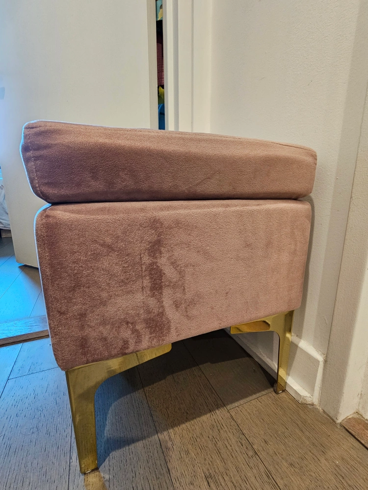 This is a cute pink velvet ottoman from ORNAVO HOME with gold legs that would look great in any room! It's in good condition and ready for a new home! It has some signs of use.