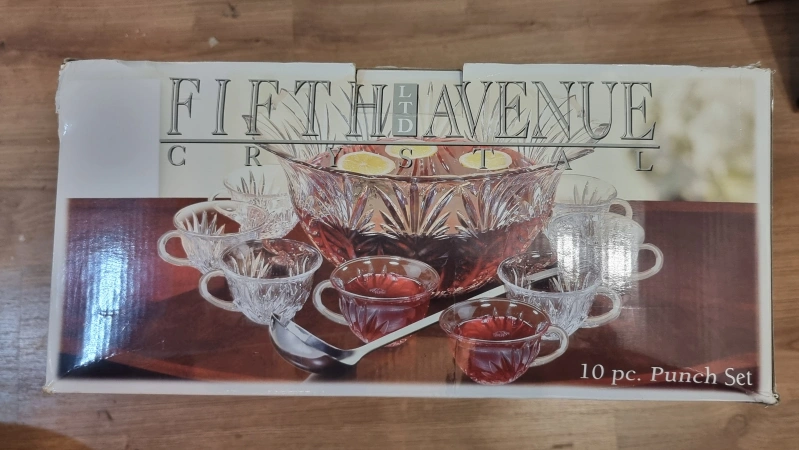Elegant crystal punch set by Fifth Avenue LTD. Includes a large punch bowl, ladle, and 8 matching cups. Perfect for parties, holidays, or entertaining guests. Still in original packaging – never used.