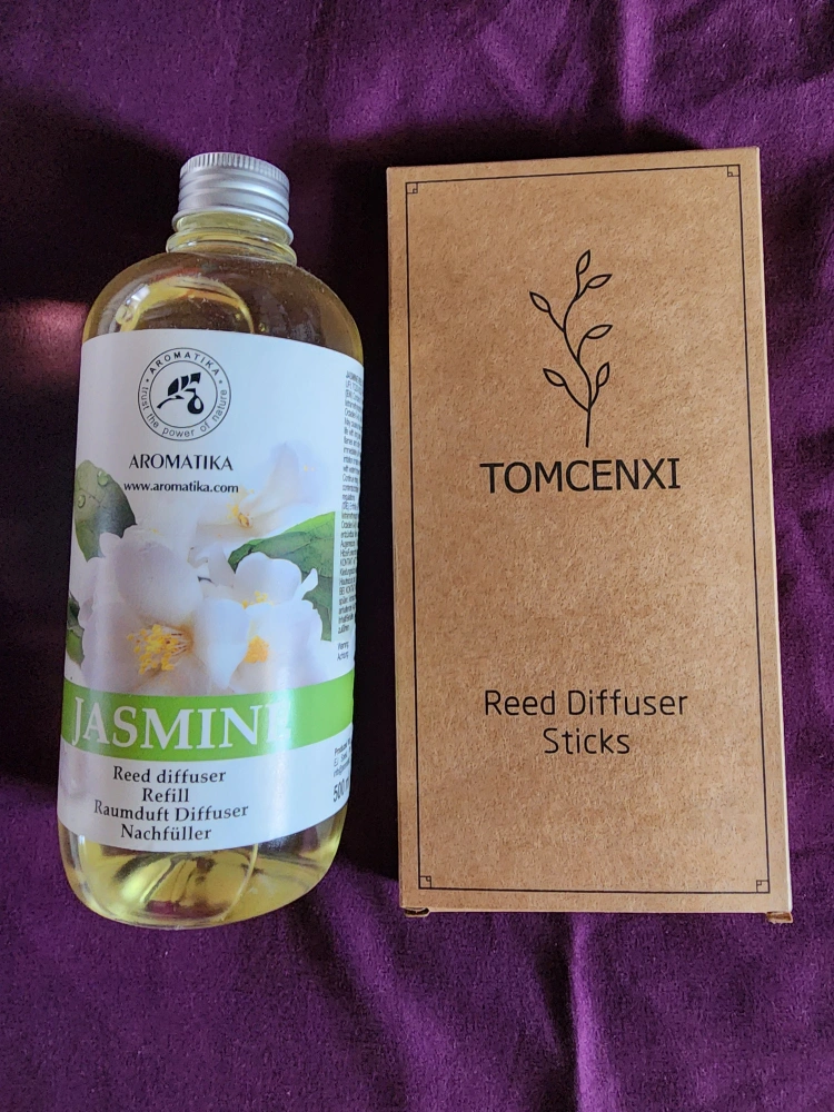 Selling an Aromatika Jasmine reed diffuser refill and a box of TOMCENXI reed diffuser sticks! The refill is a Raumbduft Diffuser Nachfuller and is brand new.