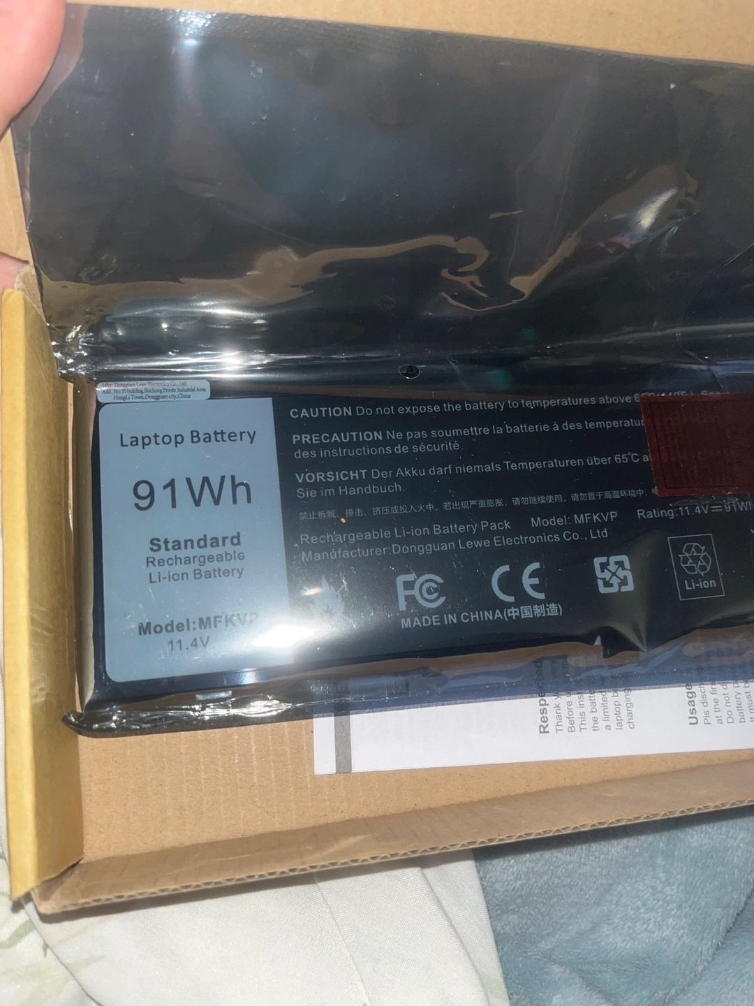 Selling a laptop battery, standard rechargeable Li-ion battery, 91Wh. Model number is MFKVP. The battery is in its original packaging.