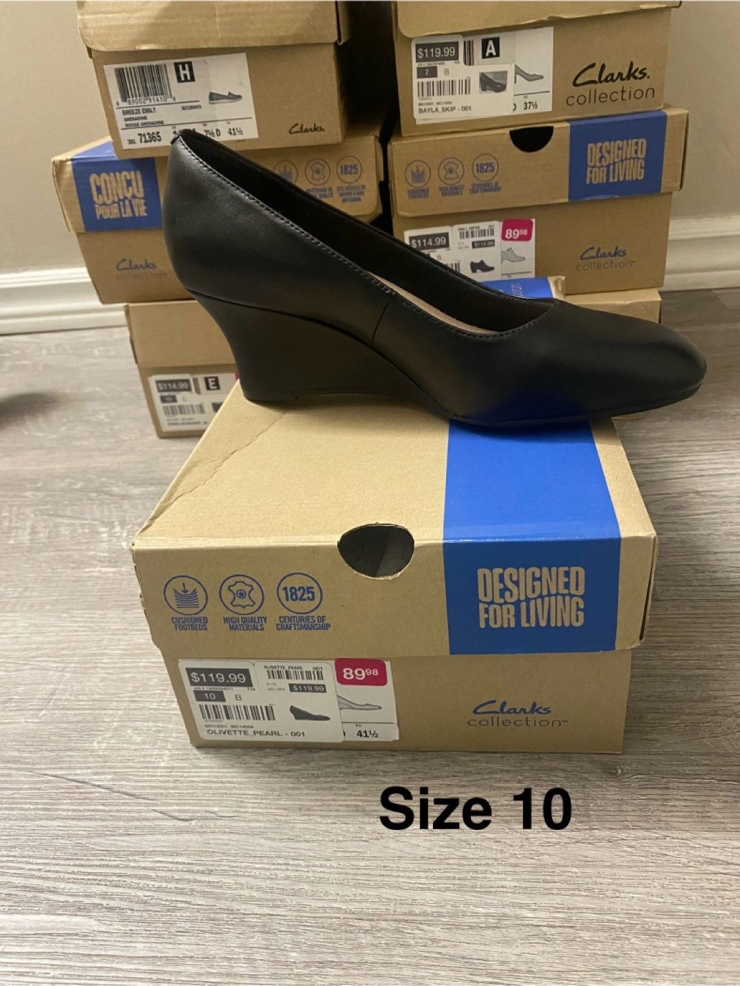 Selling a pair of Clarks Olivette Pearl wedge heels in black, size 10. The box says they have cushioned footbeds and are made with high-quality materials. Originally bought for $119.99, they're in brand new condition and come with the original box!