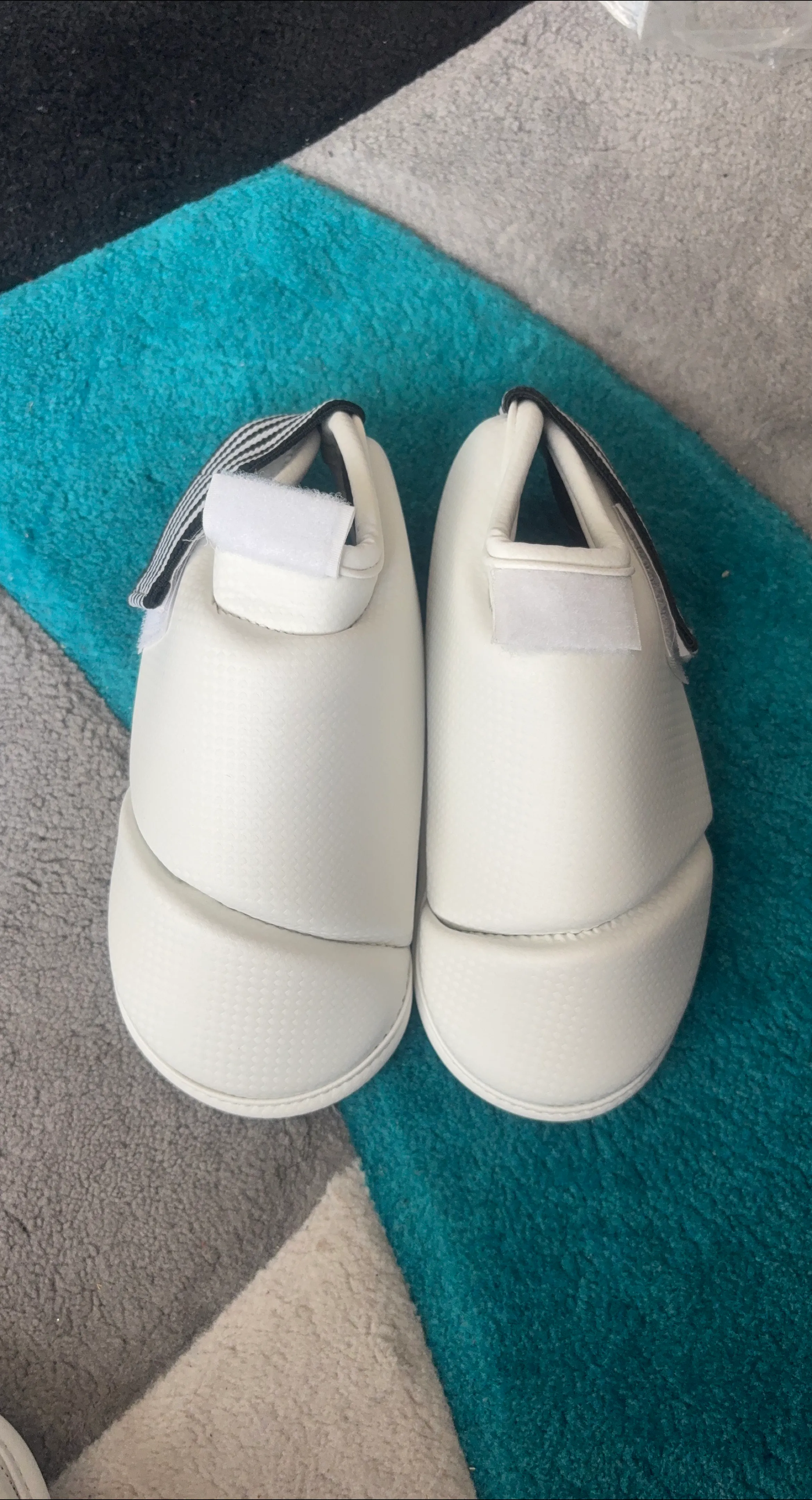 Selling a pair of comfy white slides! They have a convenient velcro strap and a textured finish. Perfect for indoor or outdoor wear