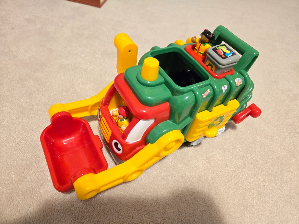This is a Tonka Chuck & Friends Recycling Truck toy! It comes with two figures and three recycling bins. It's in great condition and ready for a new home