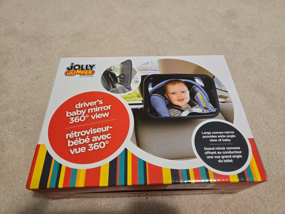 Selling a Jolly Jumper driver's baby mirror with a 360° view! This mirror provides a wide-angle view of your baby while you're driving. It's a large convex mirror that easily attaches to the headrest, so you can keep an eye on your little one.