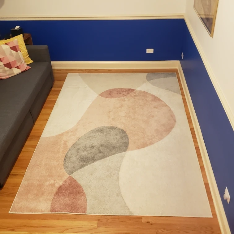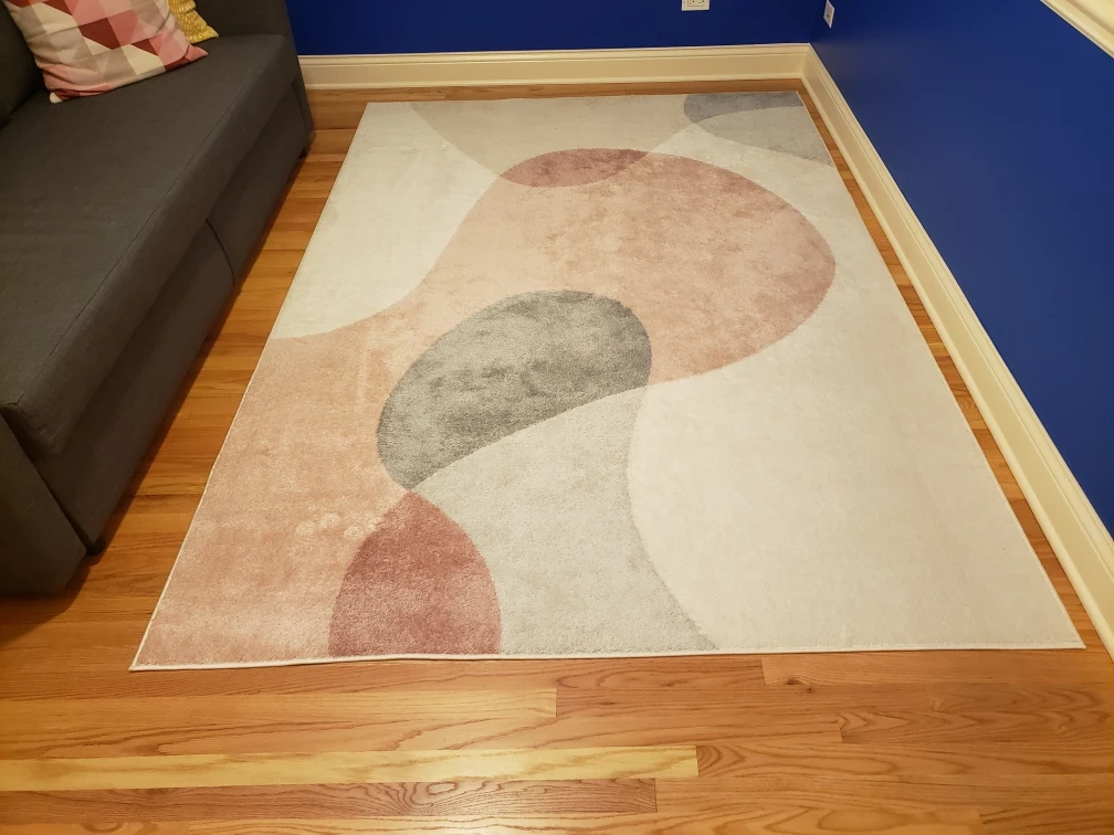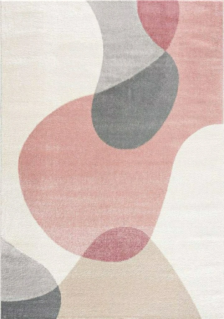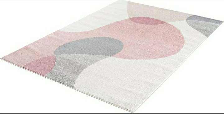 Selling a stylish large 6' x 9' abstract area rug with a modern design! It features shades of pink and gray on a light background. This rug would be a great addition to any living room, bedroom, or office space