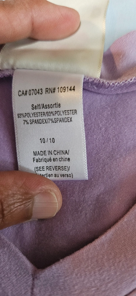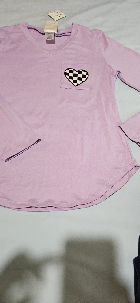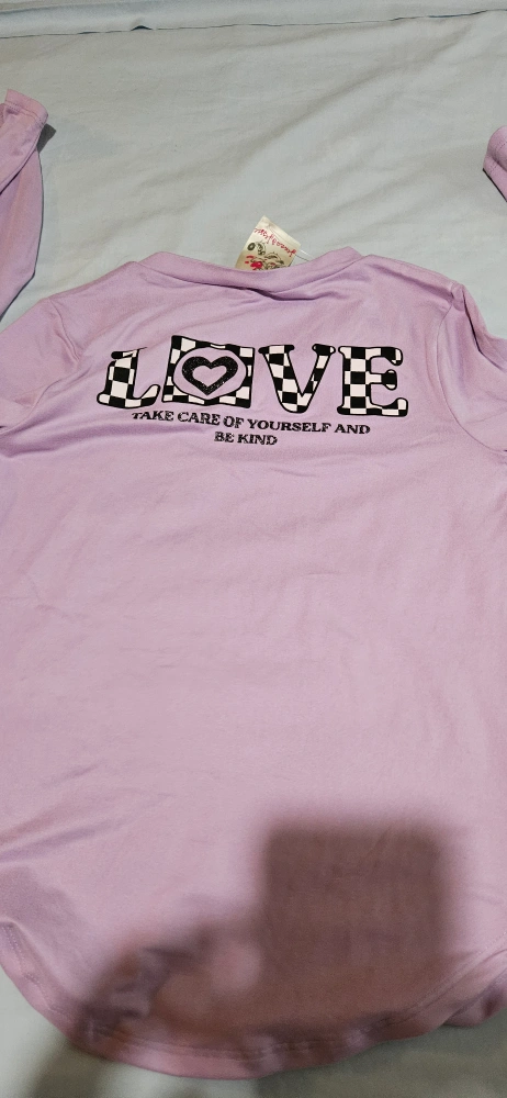 This adorable girl's long sleeve top is in great condition! It's a cute lilac colour, perfect for layering or wearing on its own. The top features a fun 'LOVE' graphic on the back and a checkered heart pocket on the front. It is made of 93% polyester and 7% spandex, so it is soft and comfy!