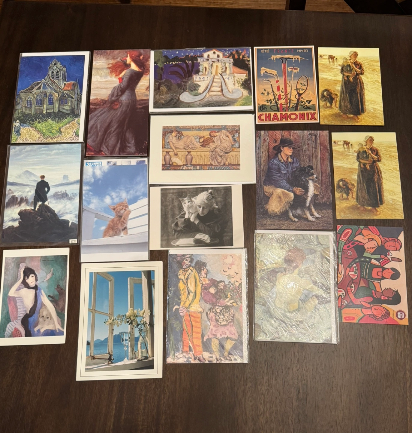 A set of 16 art postcards. Includes images of landscapes, portraits, and scenes from life. All postcards are in good condition with no visible damage. Some are still in the plastic envelope.
